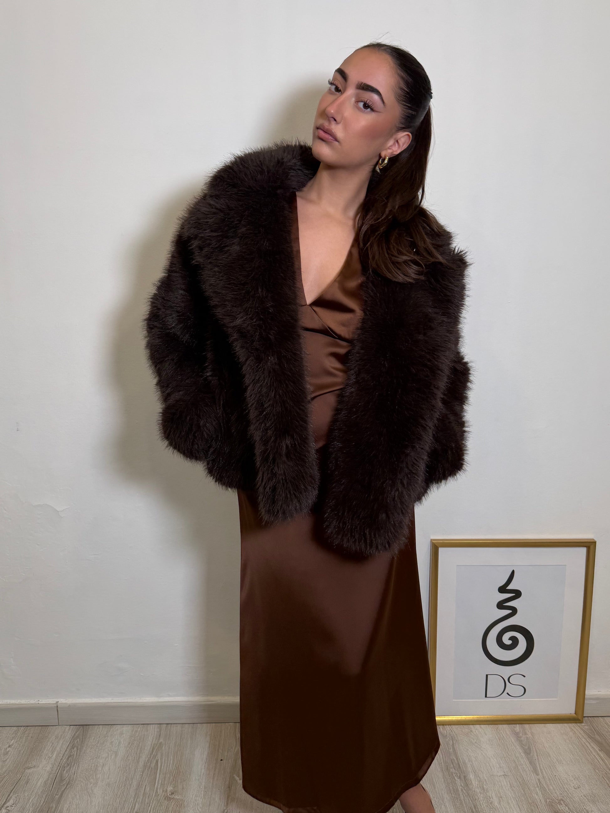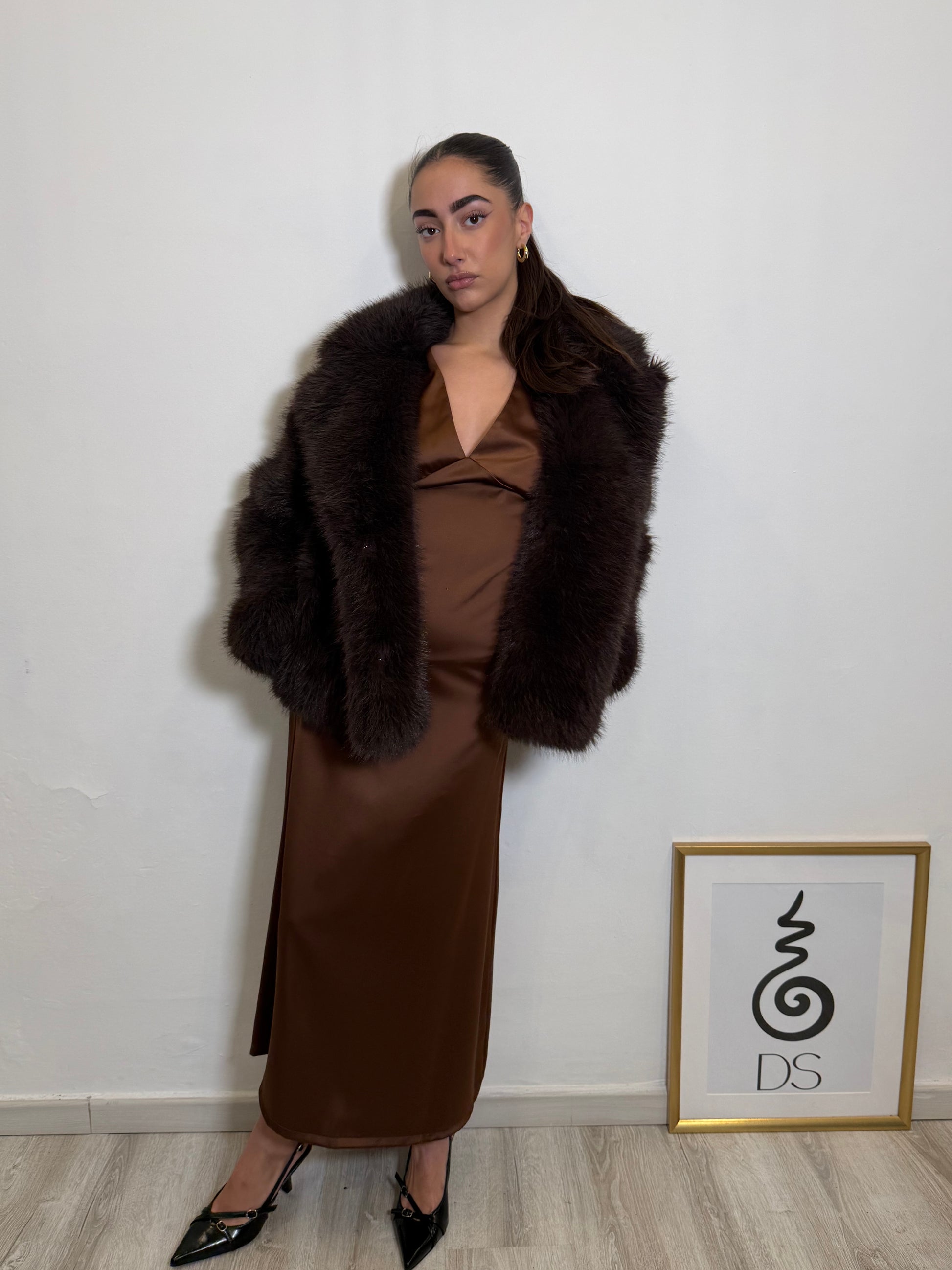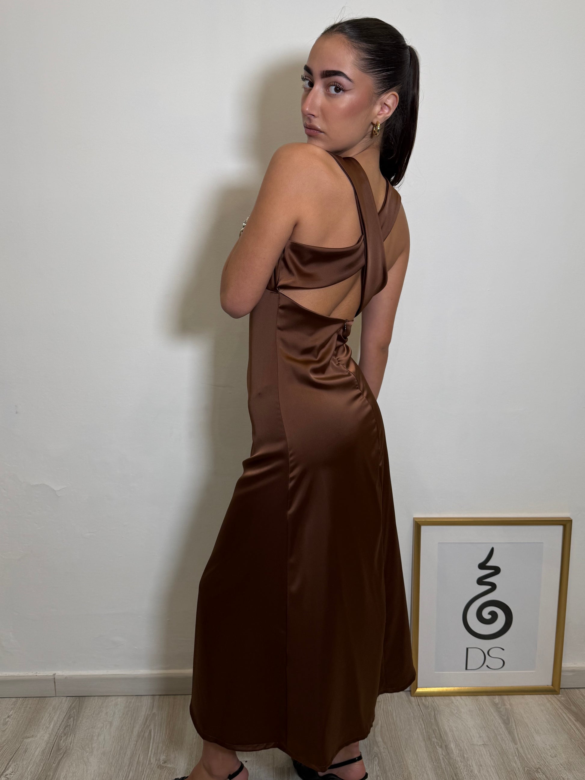 Abito lungo dal design essenziale e sofisticato, realizzato in tessuto satinato dall’effetto luminoso. Lo scollo a V valorizza il décolleté, mentre la schiena scoperta con incrocio dona femminilità e carattere al capo.