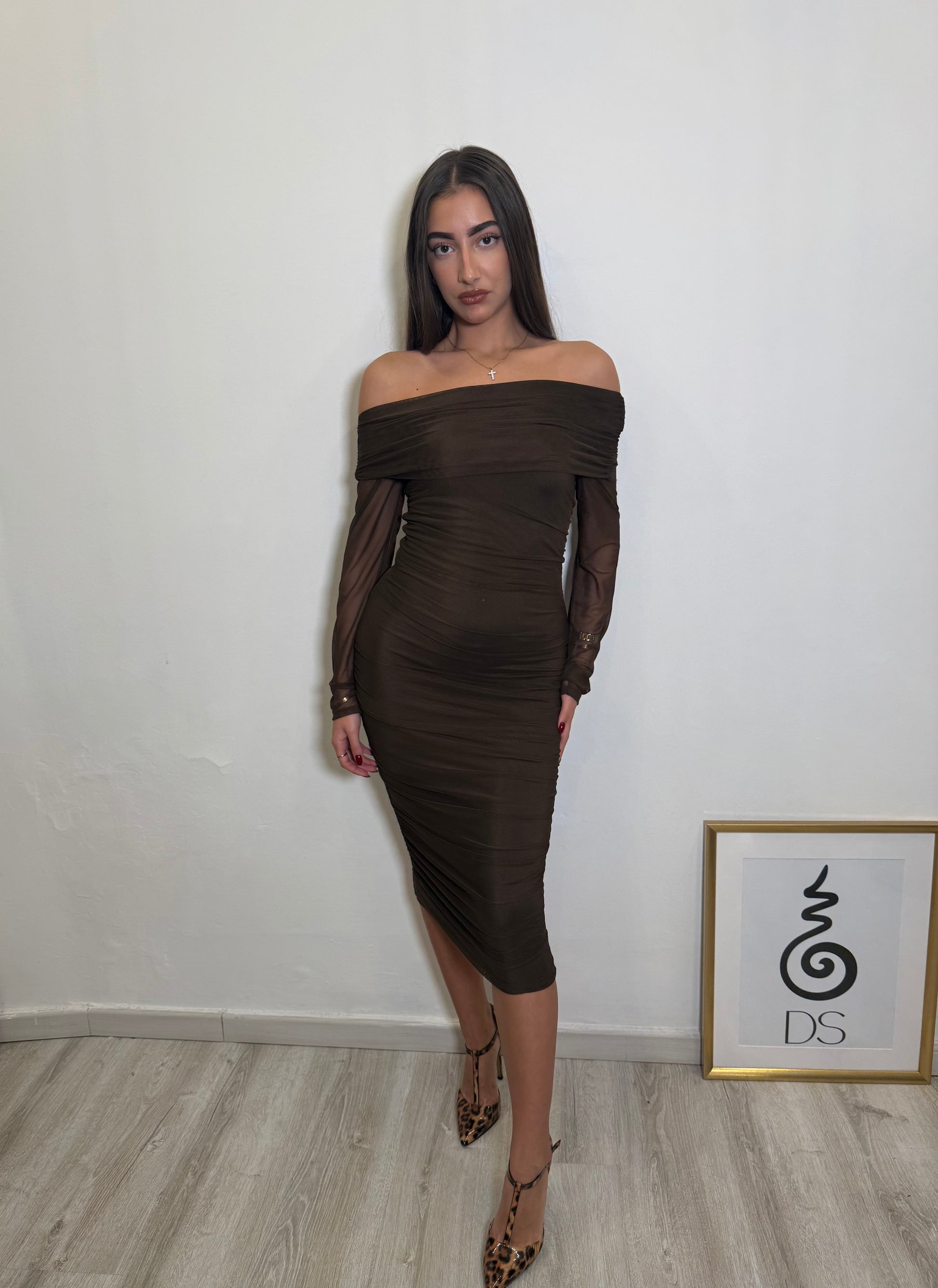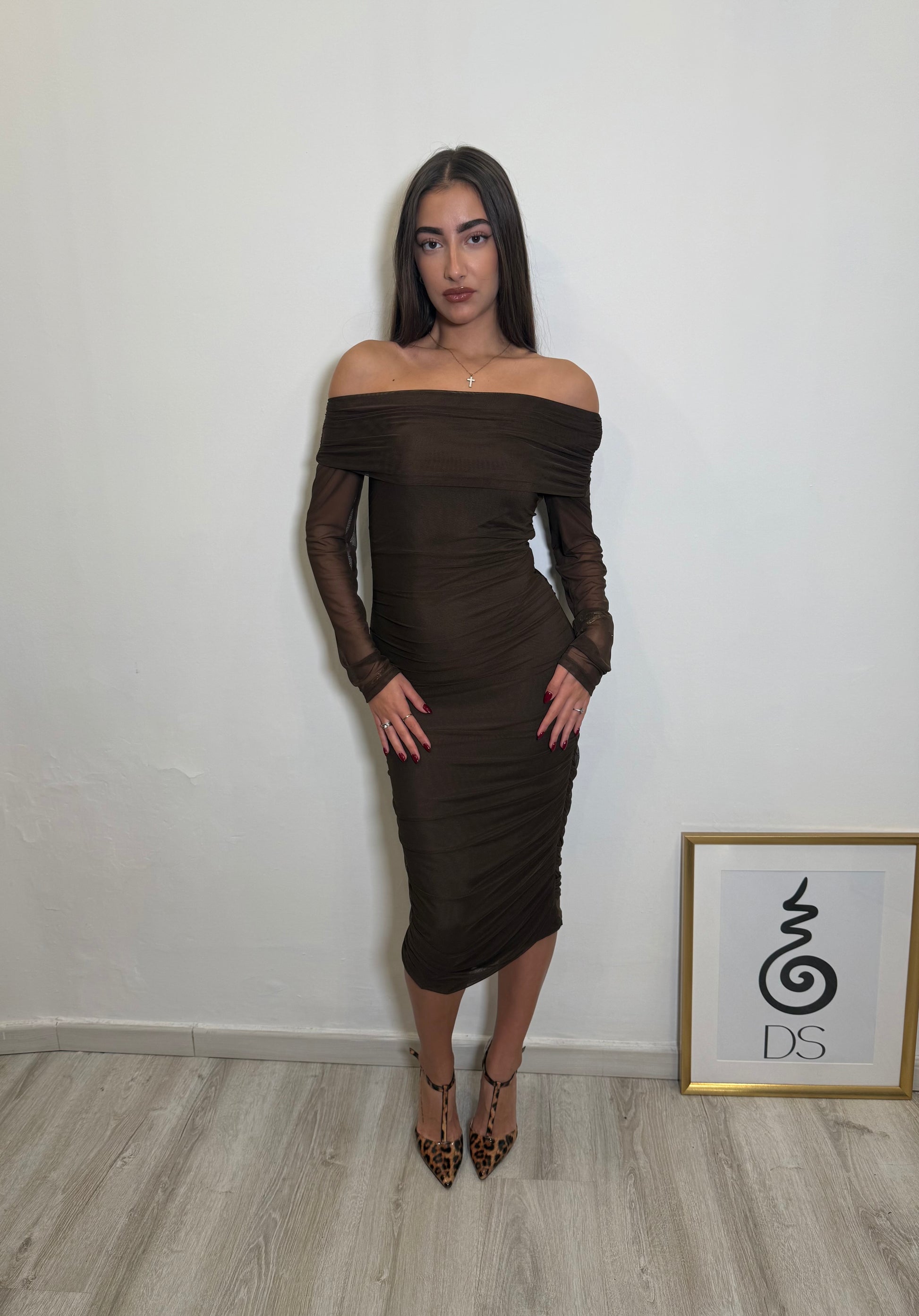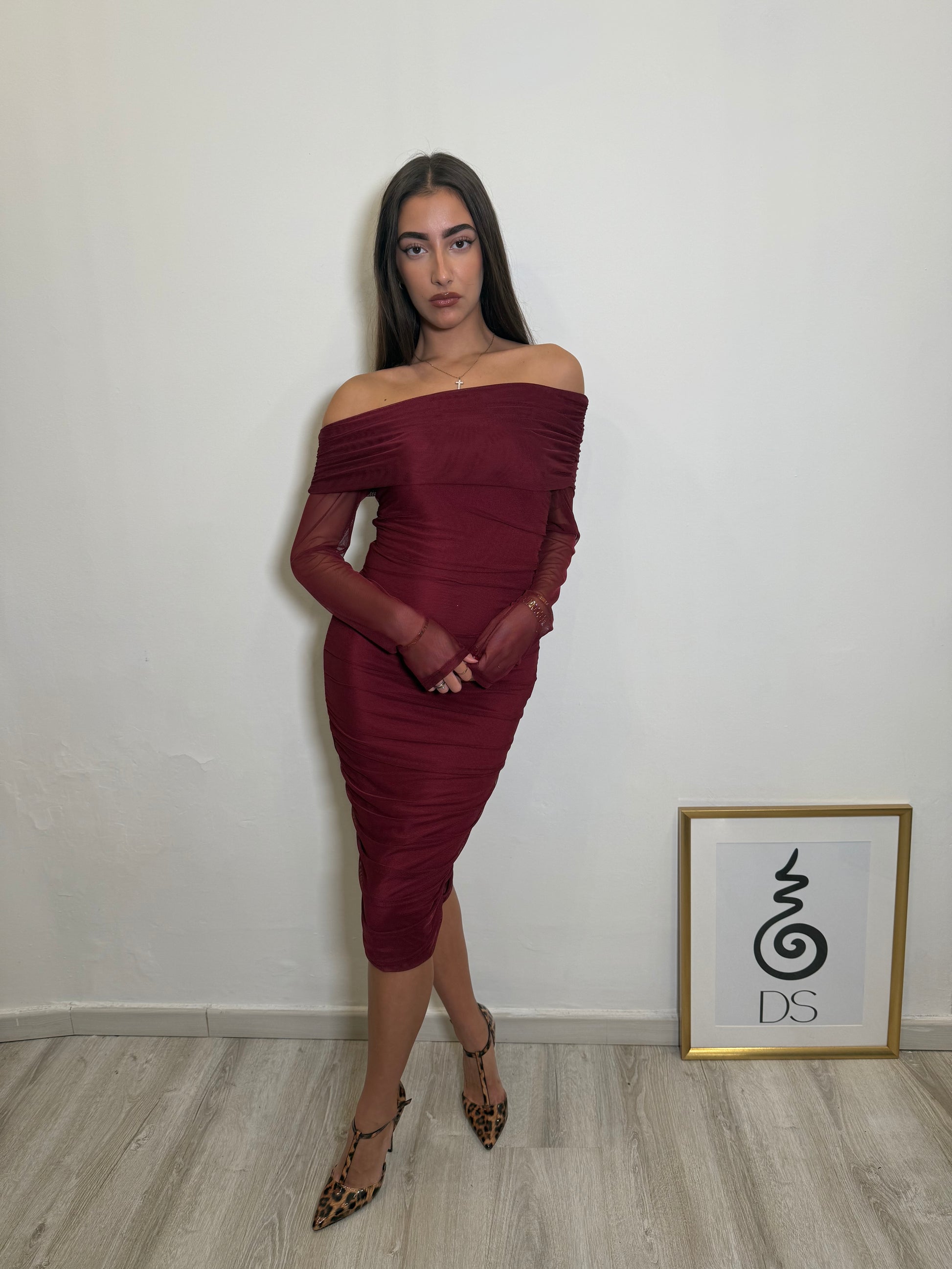 Abito midi off shoulder con manica lunga in tulle e arricciatura laterale. Design aderente che valorizza la silhouette, con scollo morbido effetto bardot. Tessuto elasticizzato, confortevole e avvolgente.Perfetto per cerimonie, eventi serali e occasioni speciali.