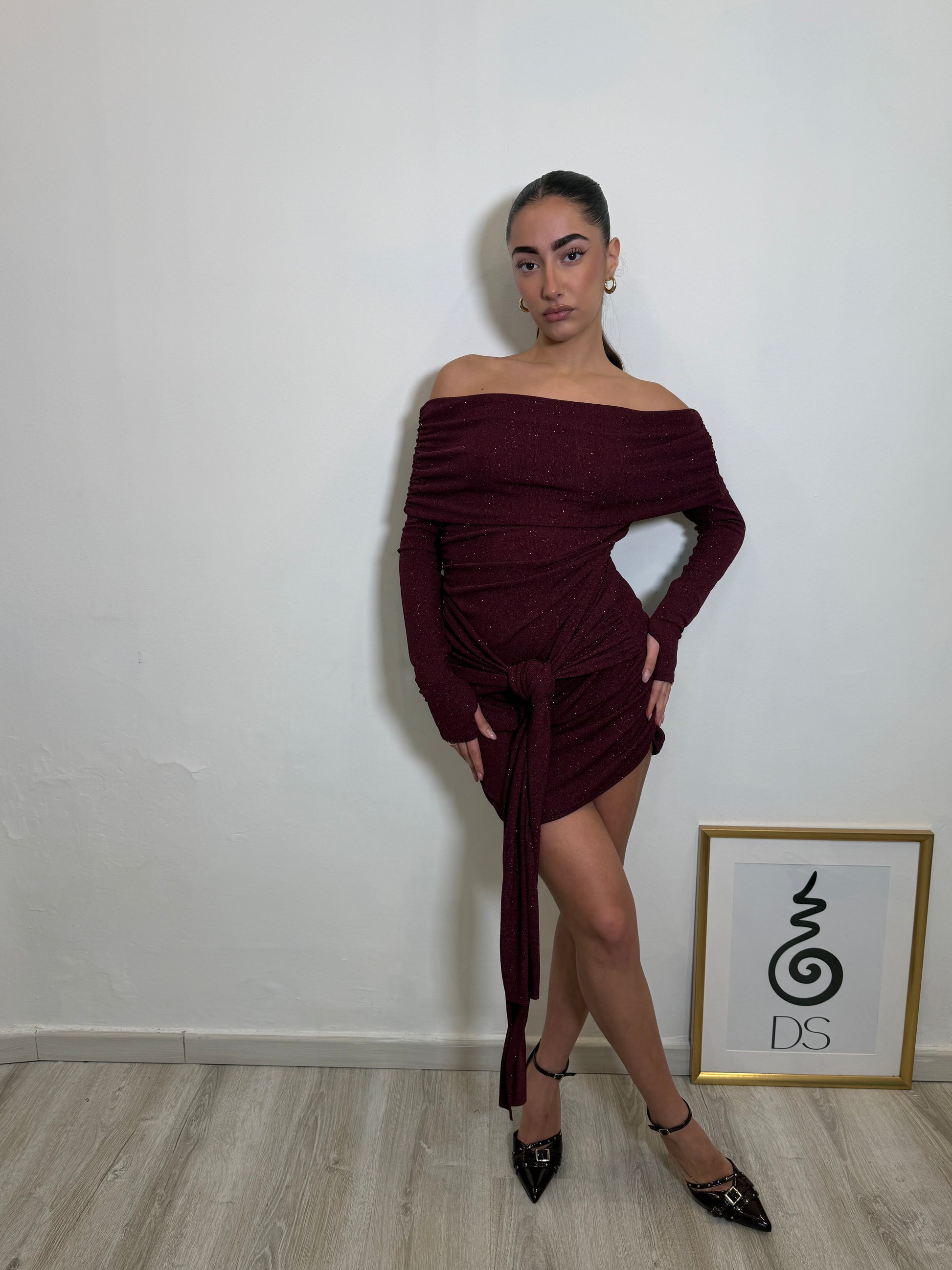 Abito corto elegante e femminile, caratterizzato da scollo off-shoulder che valorizza spalle e décolleté. Il drappeggio su tutta la lunghezza e il nodo frontale con laccetto donano movimento e slanciano la silhouette.