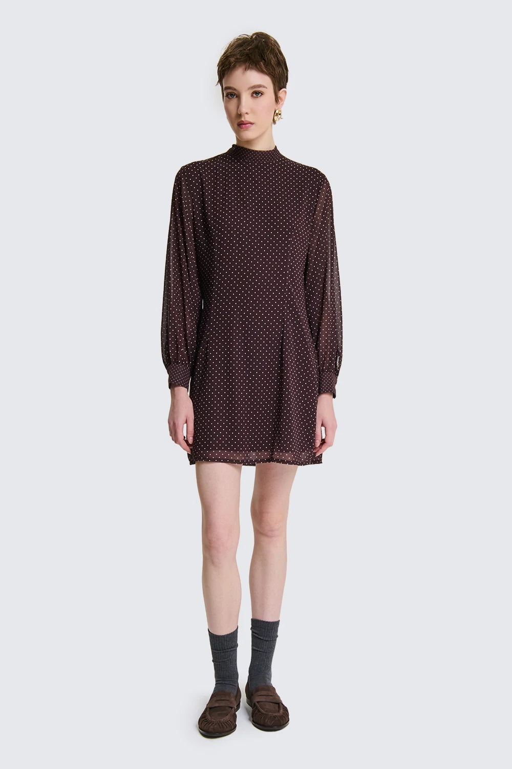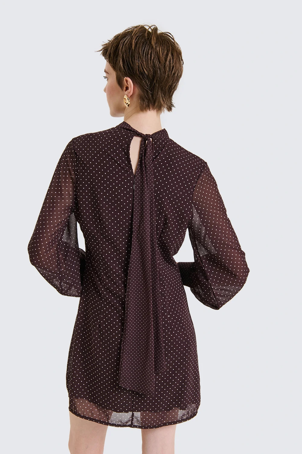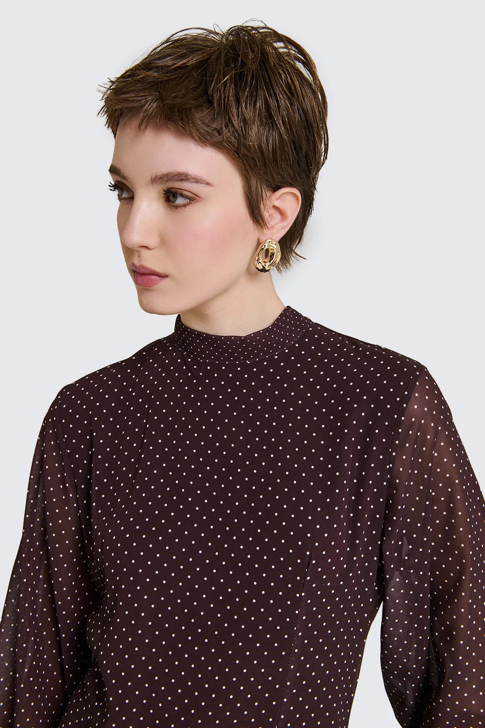 Abito girocollo con Tessuto stampa pois, fodera gonna interna. Manica lunga con polsini e bottoneDettaglio Fusciacca sul collo.