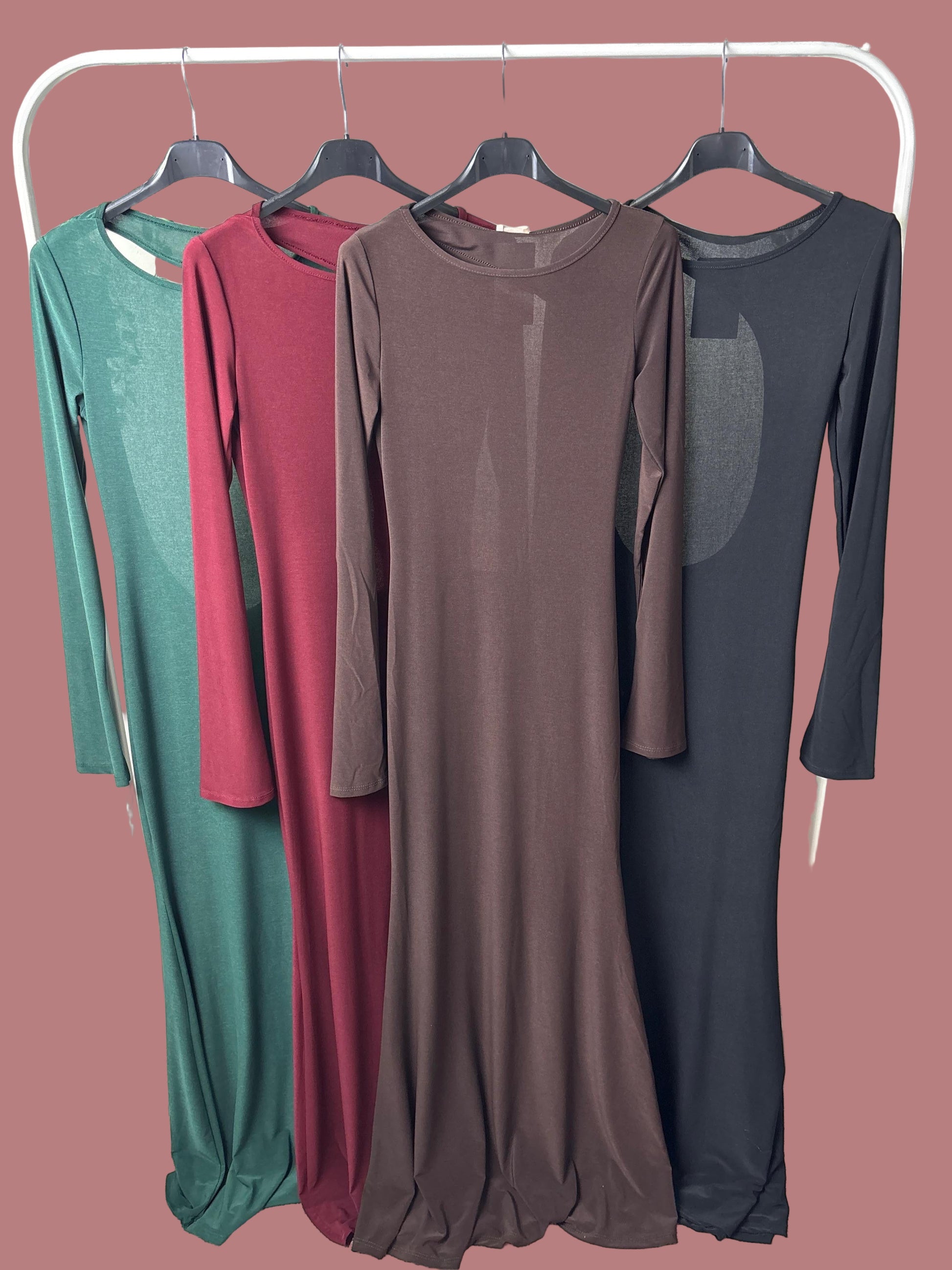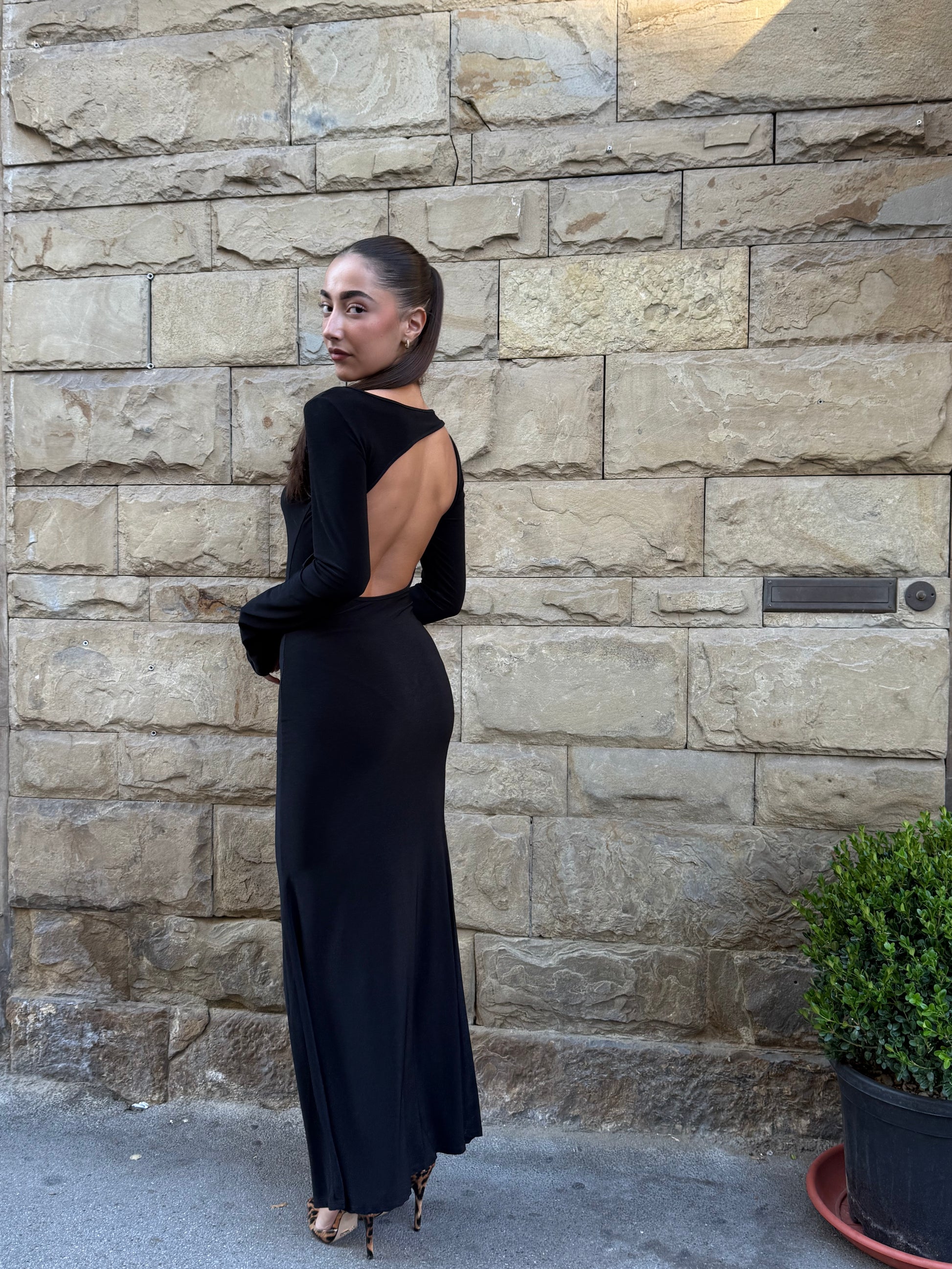 Elegante, sensuale e minimal: avvolge le forme con un taglio fluido e maniche lunghe. Perfetto per serate speciali o eventi dove il nero parla da sé.