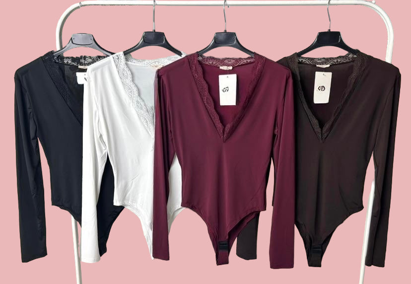 Body a maniche lunghe in tessuto elasticizzato con scollo a V rifinito in pizzo.