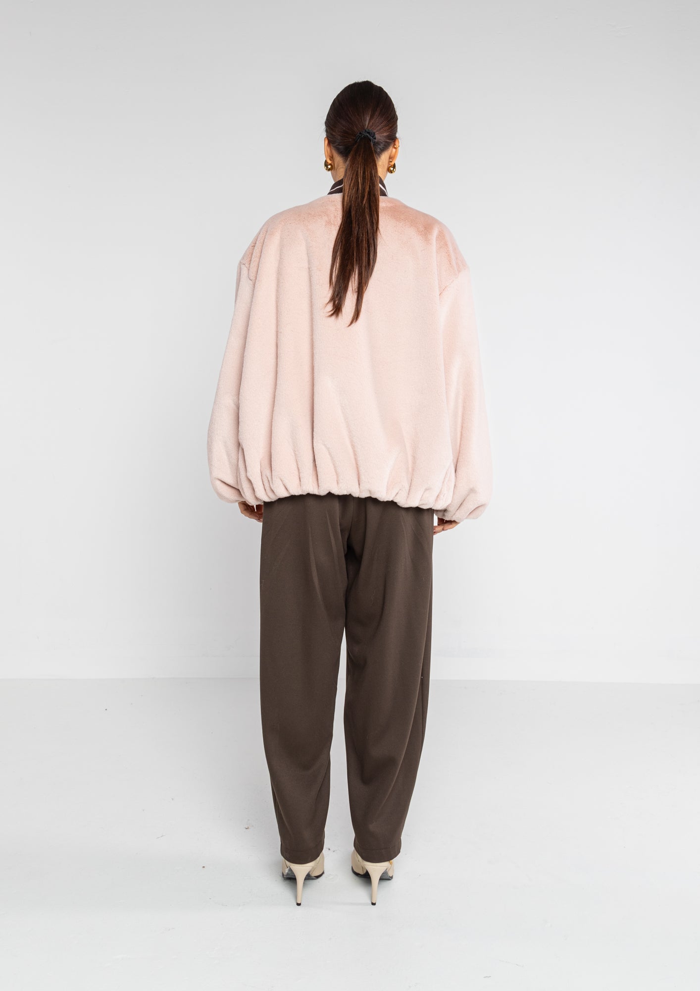 Bomber eco pelliccia rosa cipria con dettagli marrone cioccolato. Vestibilità morbida.