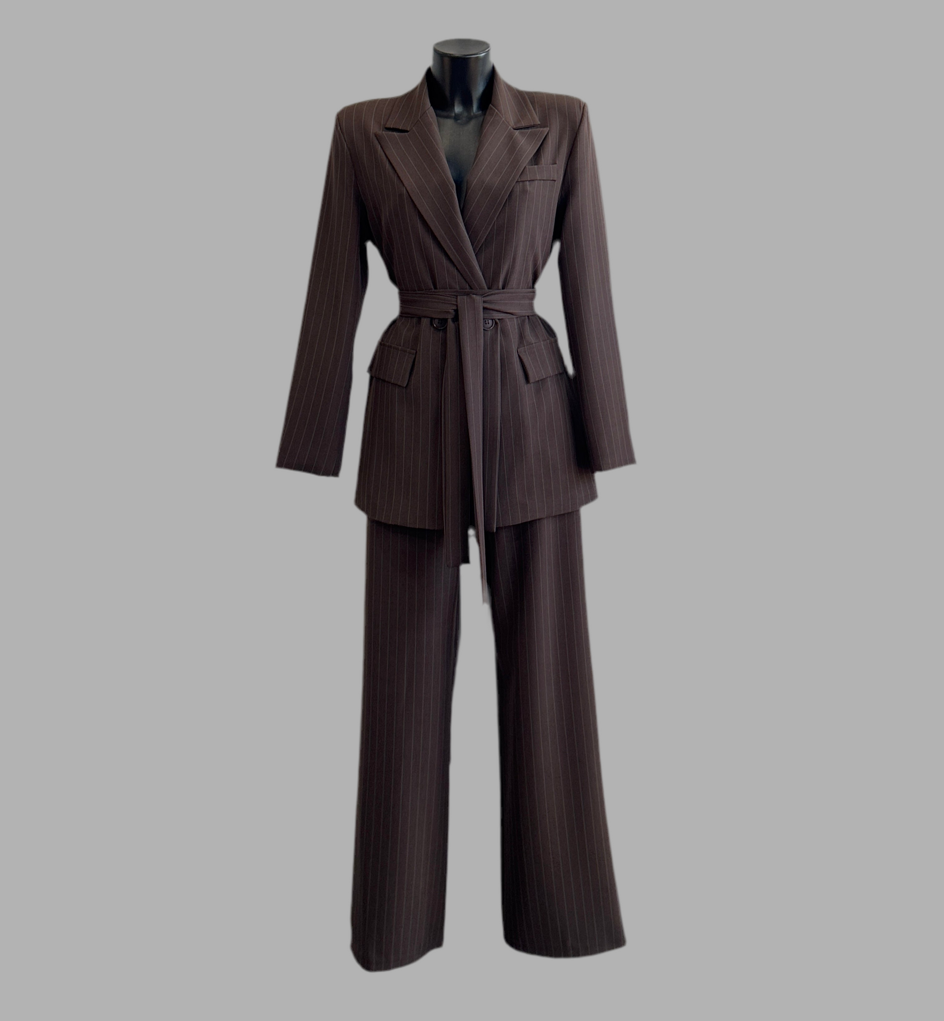 Tailleur gessato composto da giacca doppio petto con chiusura laccio in vita pantaloni vita alta a palazzo elastico sul retro. Fantasia gessato.