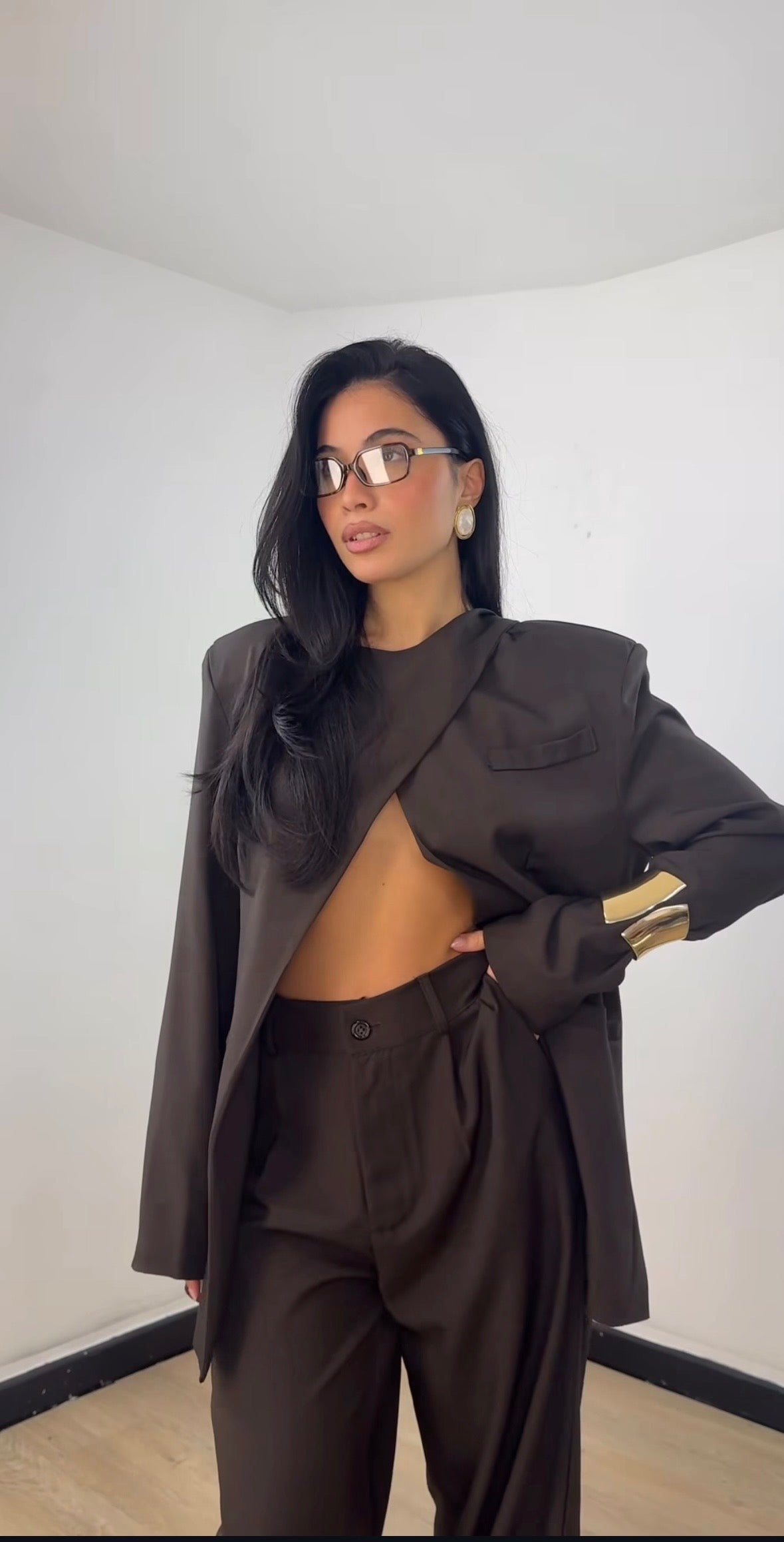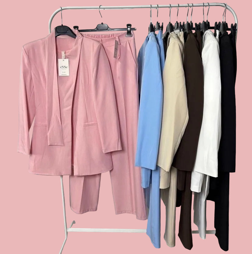 Completo composto da blazer dal taglio sartoriale con rever classico e linea pulita, chiusura 1 bottone sulla spalla; abbinato a pantalone a gamba ampia con vita elasticizzata sul retro per una vestibilità confortevole. Realizzato in tessuto leggero e fluido, garantisce una caduta elegante e naturale. Perfetto da indossare come coordinato o separatamente per look versatili e raffinati.