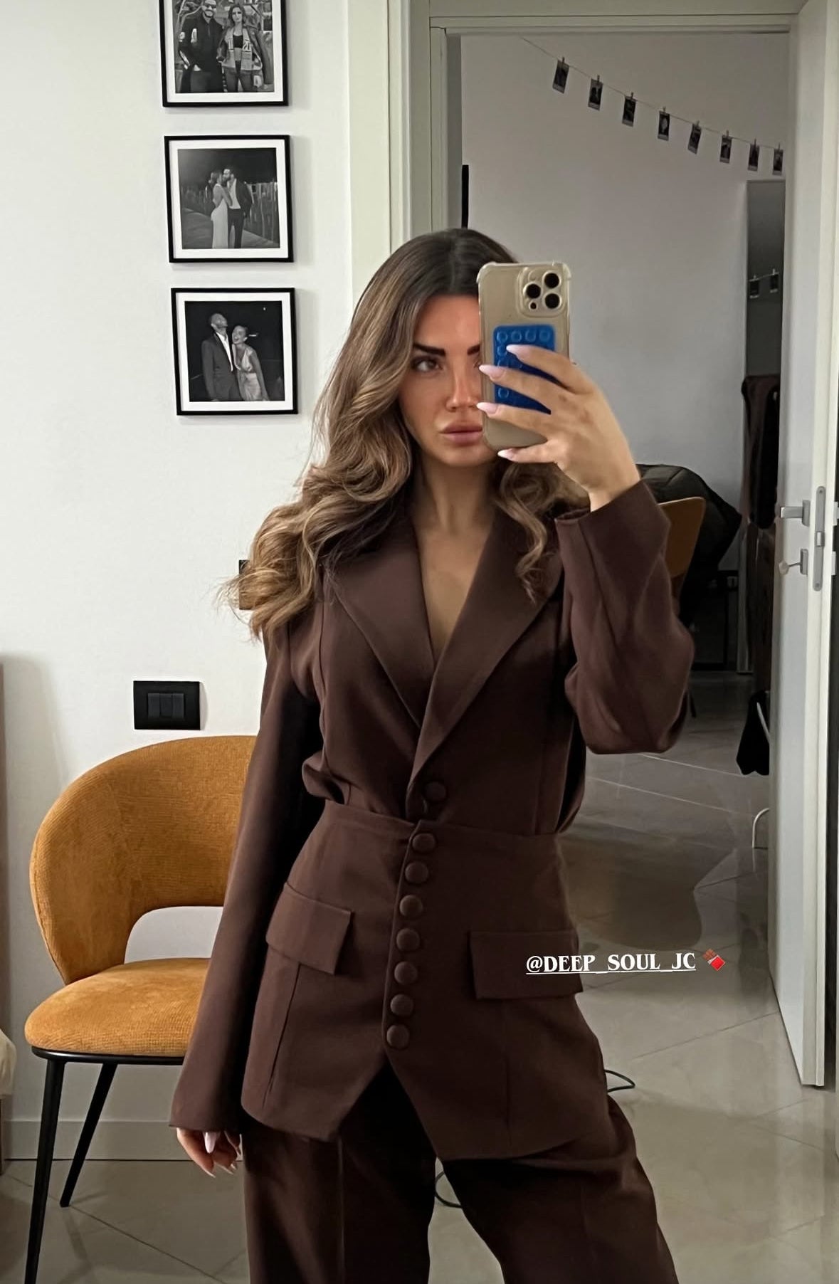 Raffinato, moderno e super femminile: questo completo in tonalità chocolate è la scelta ideale per chi cerca un look deciso ma elegante.