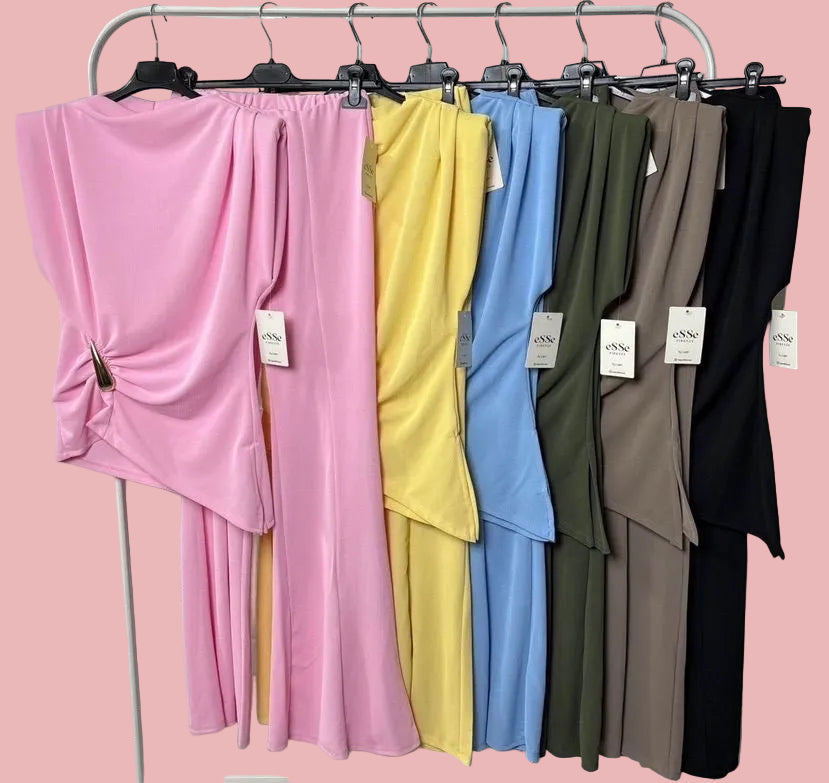 Un completo che valorizza la silhouette con linee fluide e dettagli raffinati. Il top con spalla strutturata e drappeggio laterale, impreziosito da accessorio metallico dorato, esalta il punto vita. Il pantalone a zampa slancia la figura e dona movimento ad ogni passo. Elegante, moderno, femminile. Perfetto per chi vuole distinguersi con classe.