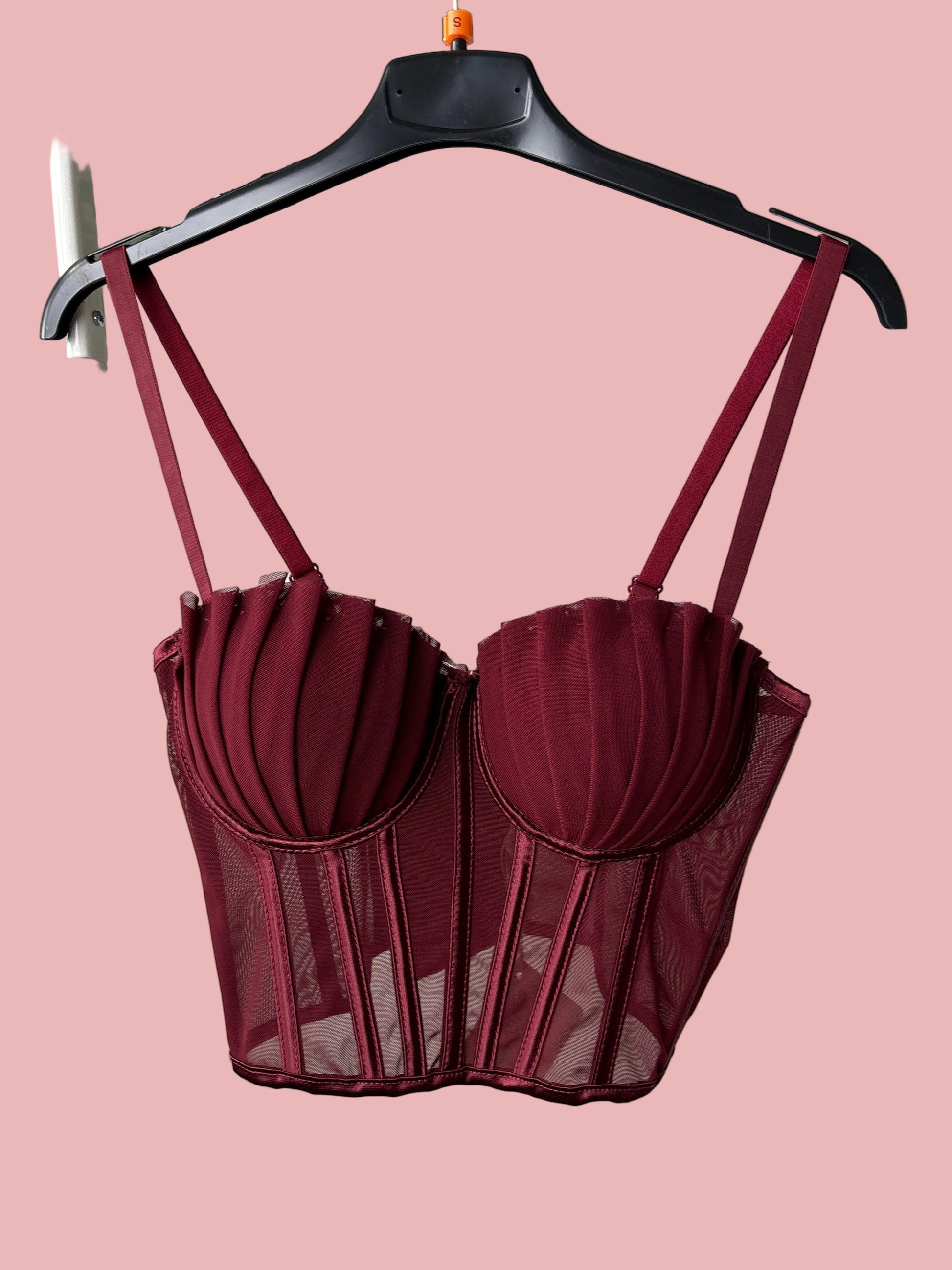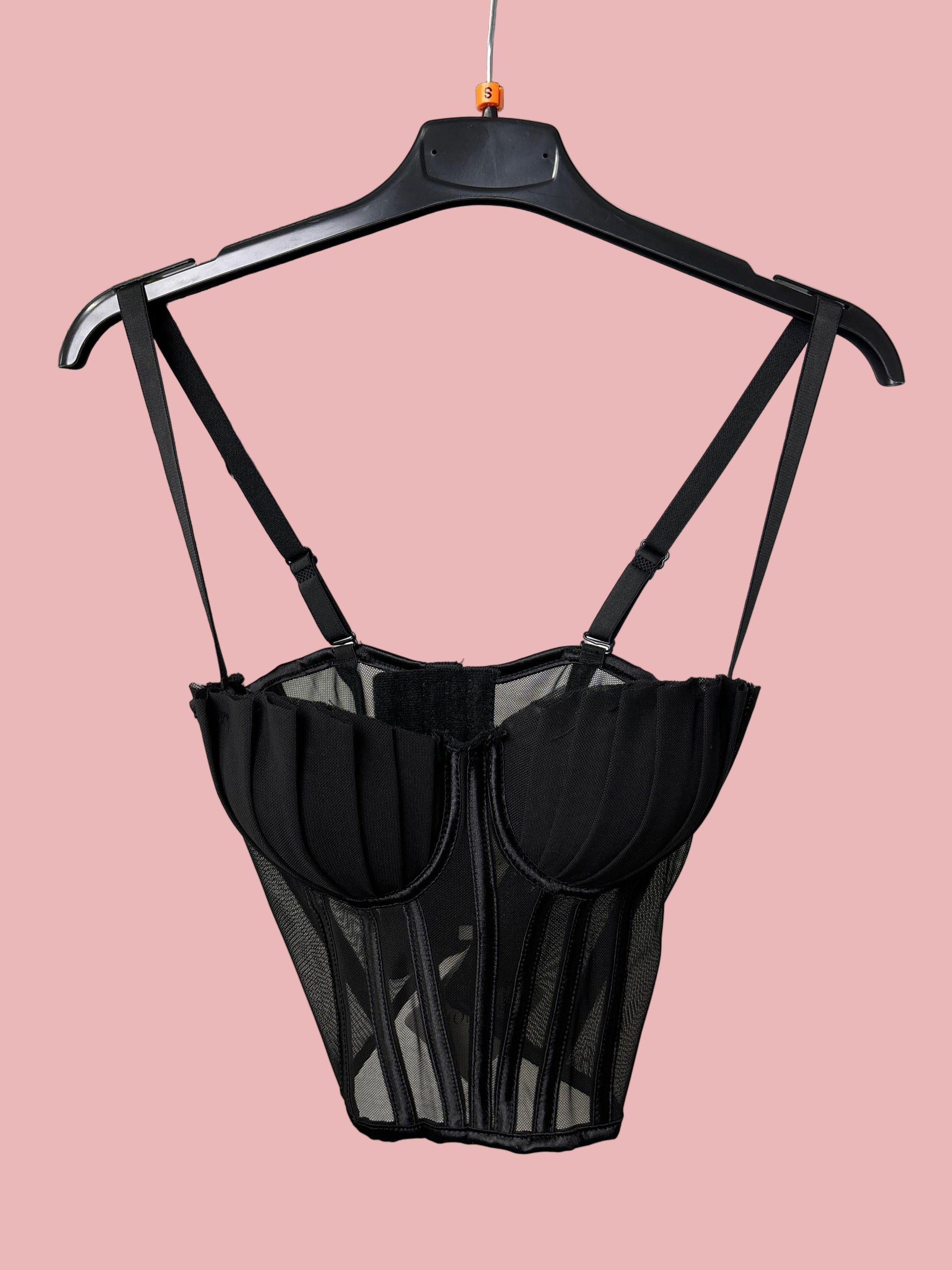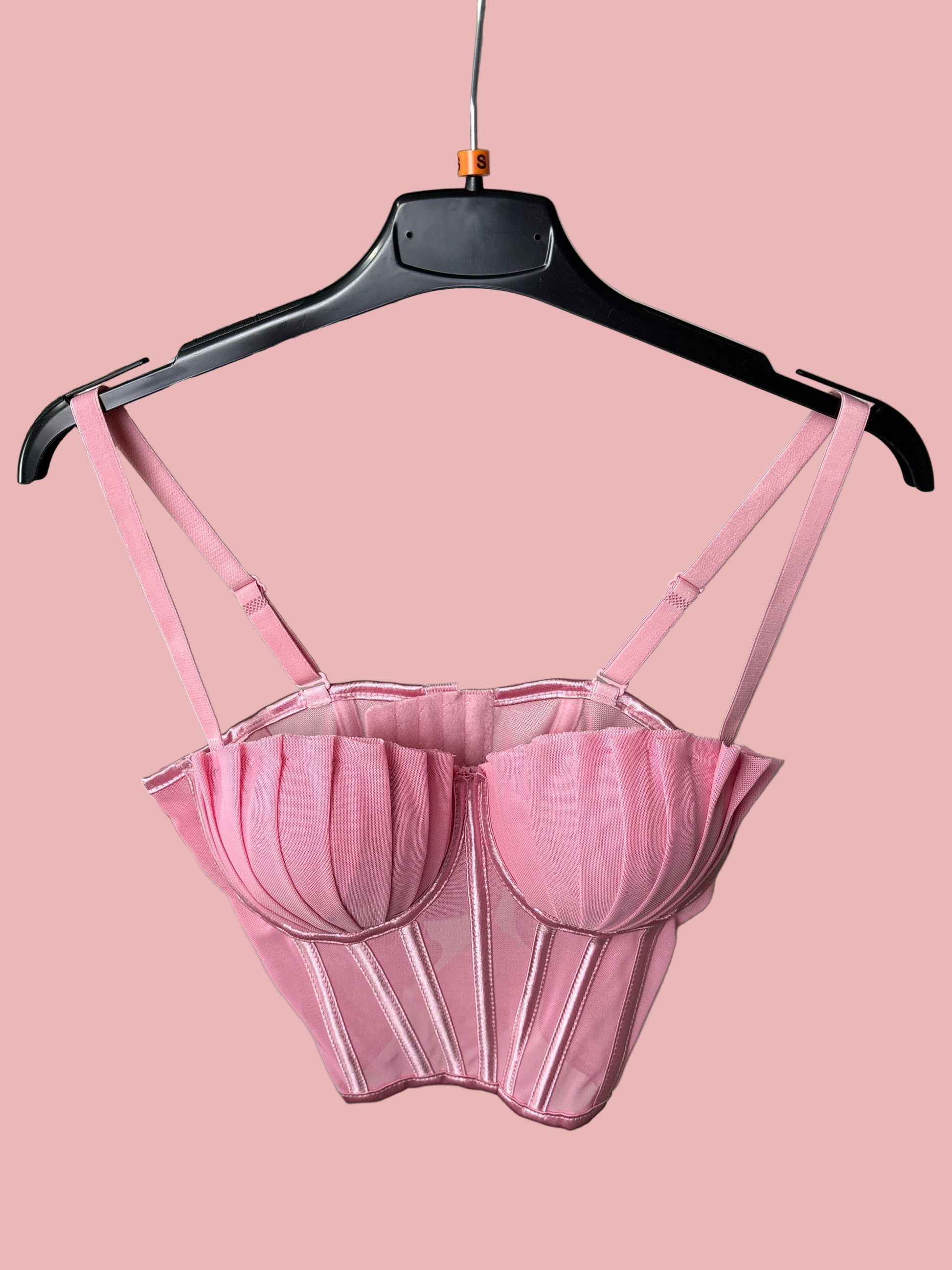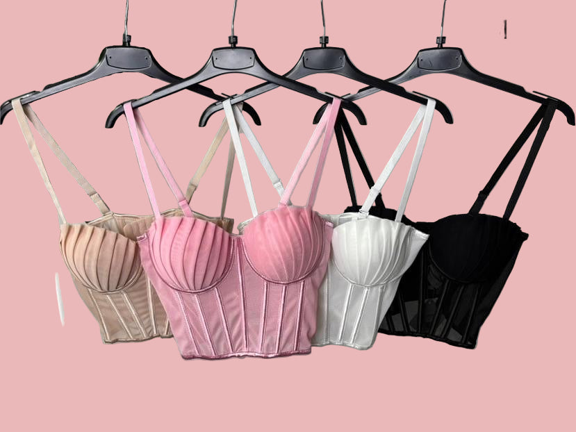 Corsetto strutturato in tessuto mesh con stecche verticali e coppe effetto plissé che donano volume e definizione al décolleté. Inserti semi-trasparenti sul busto, stecche modellanti e doppie spalline regolabili per una vestibilità elegante e sensuale.