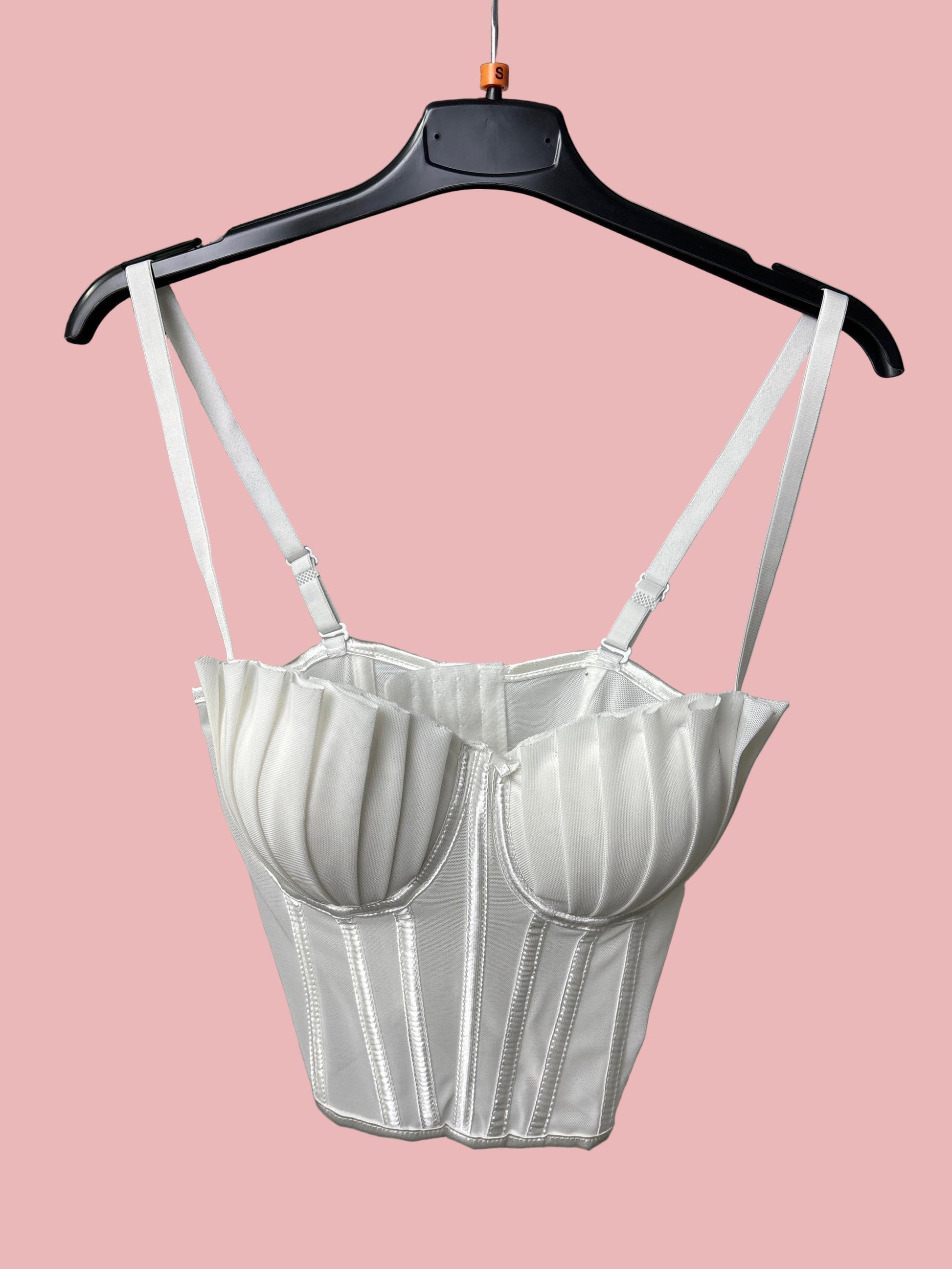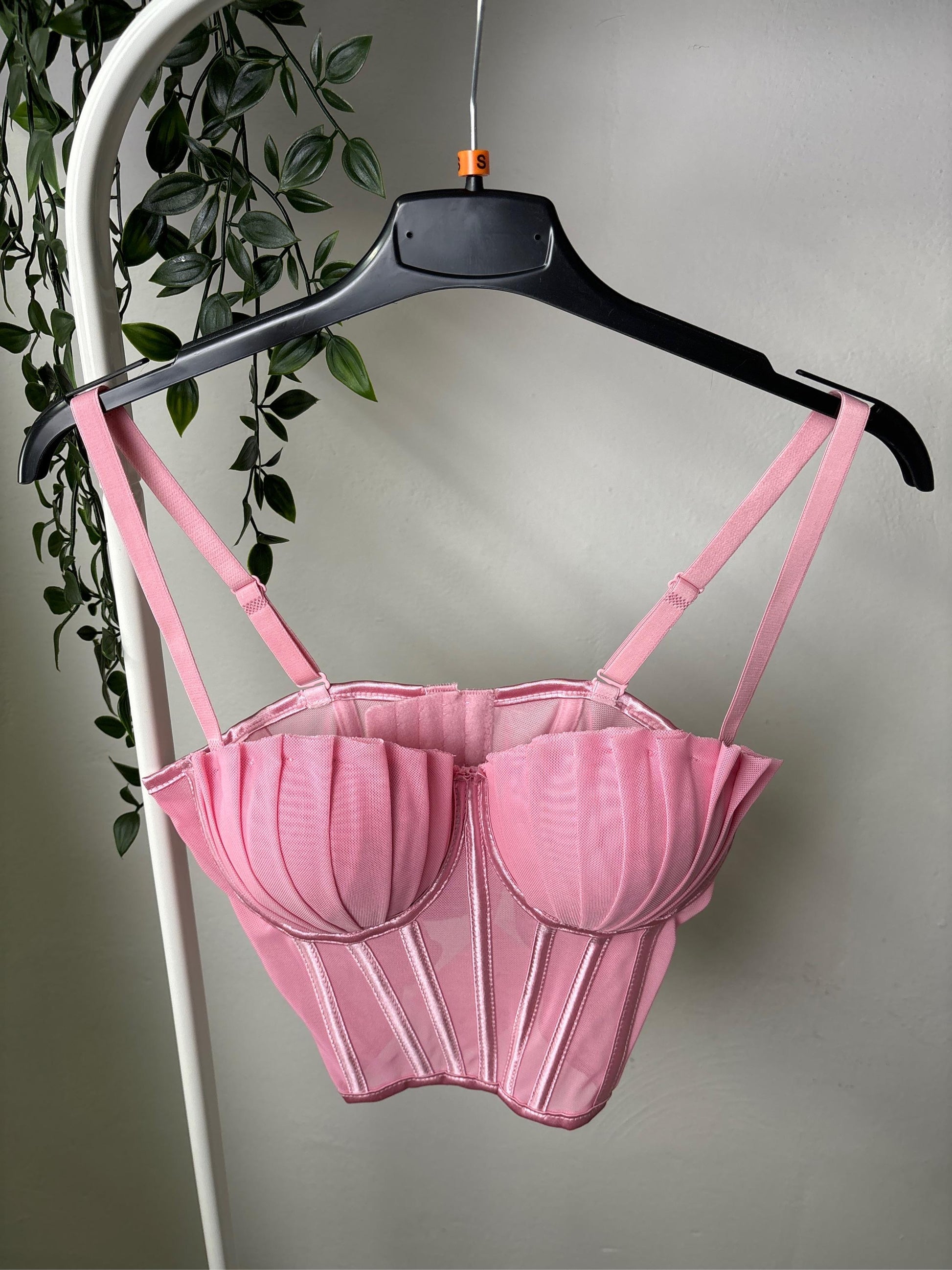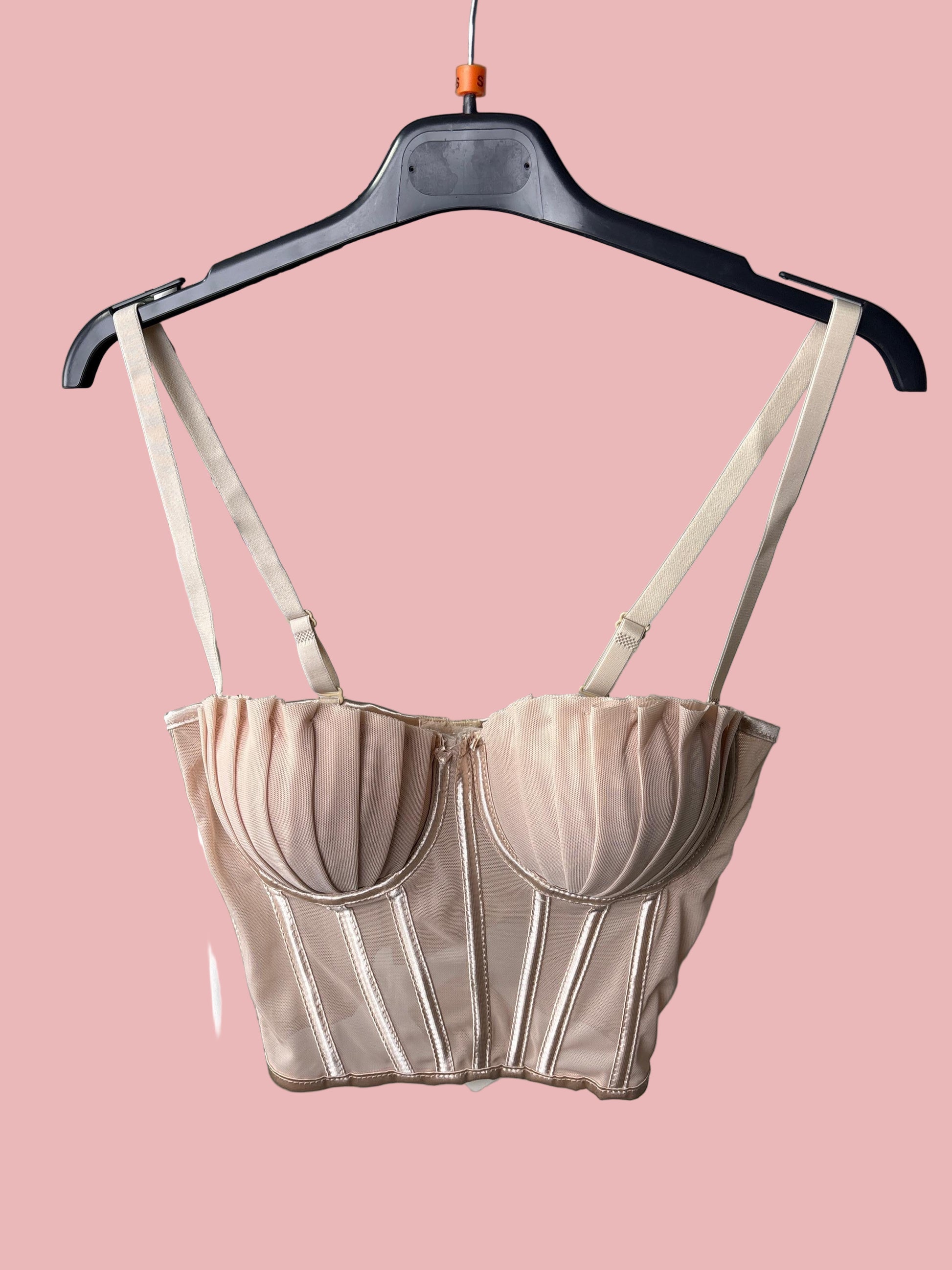 Corsetto strutturato in tessuto mesh con stecche verticali e coppe effetto plissé che donano volume e definizione al décolleté. Inserti semi-trasparenti sul busto, stecche modellanti e doppie spalline regolabili per una vestibilità elegante e sensuale.