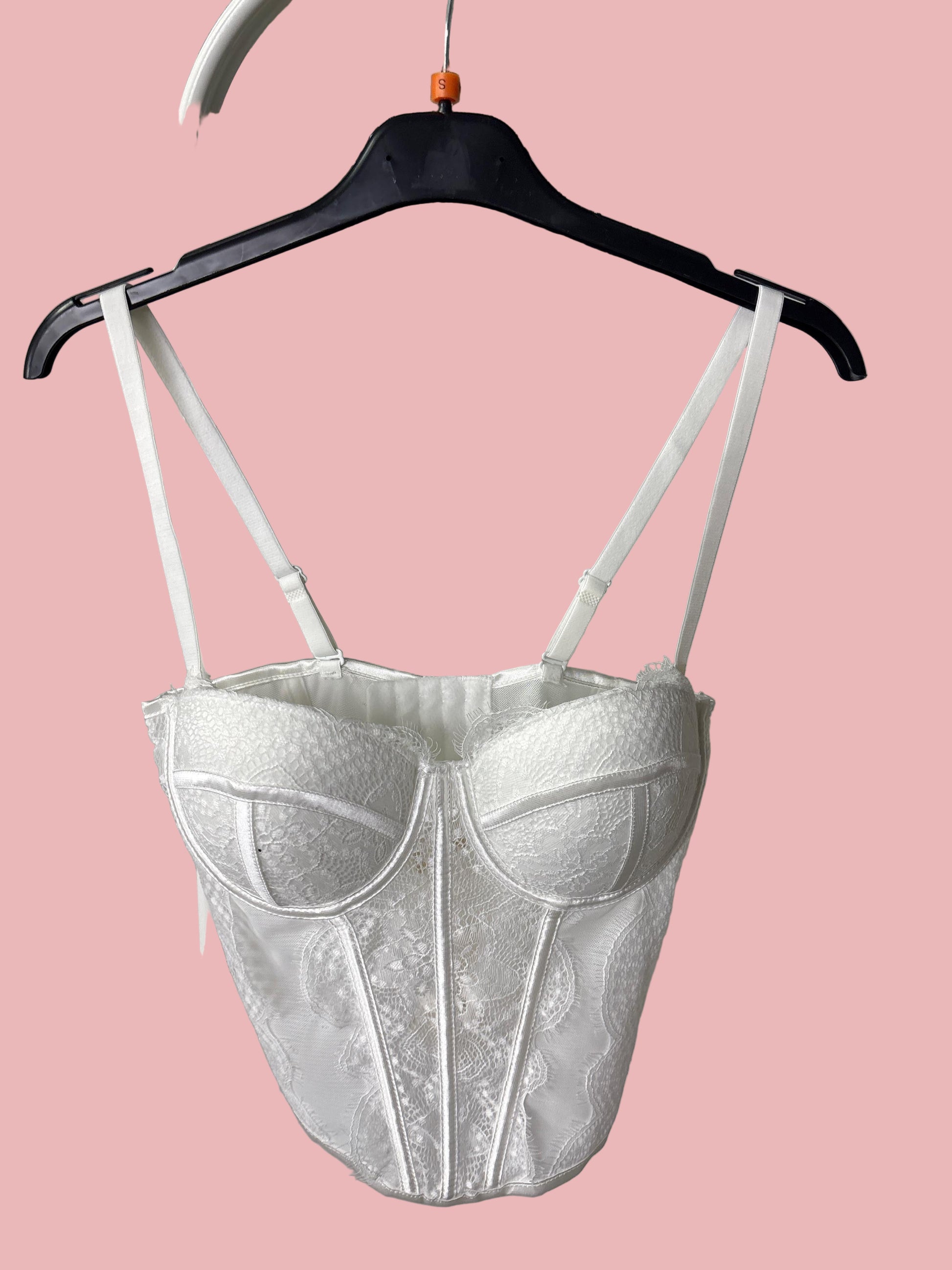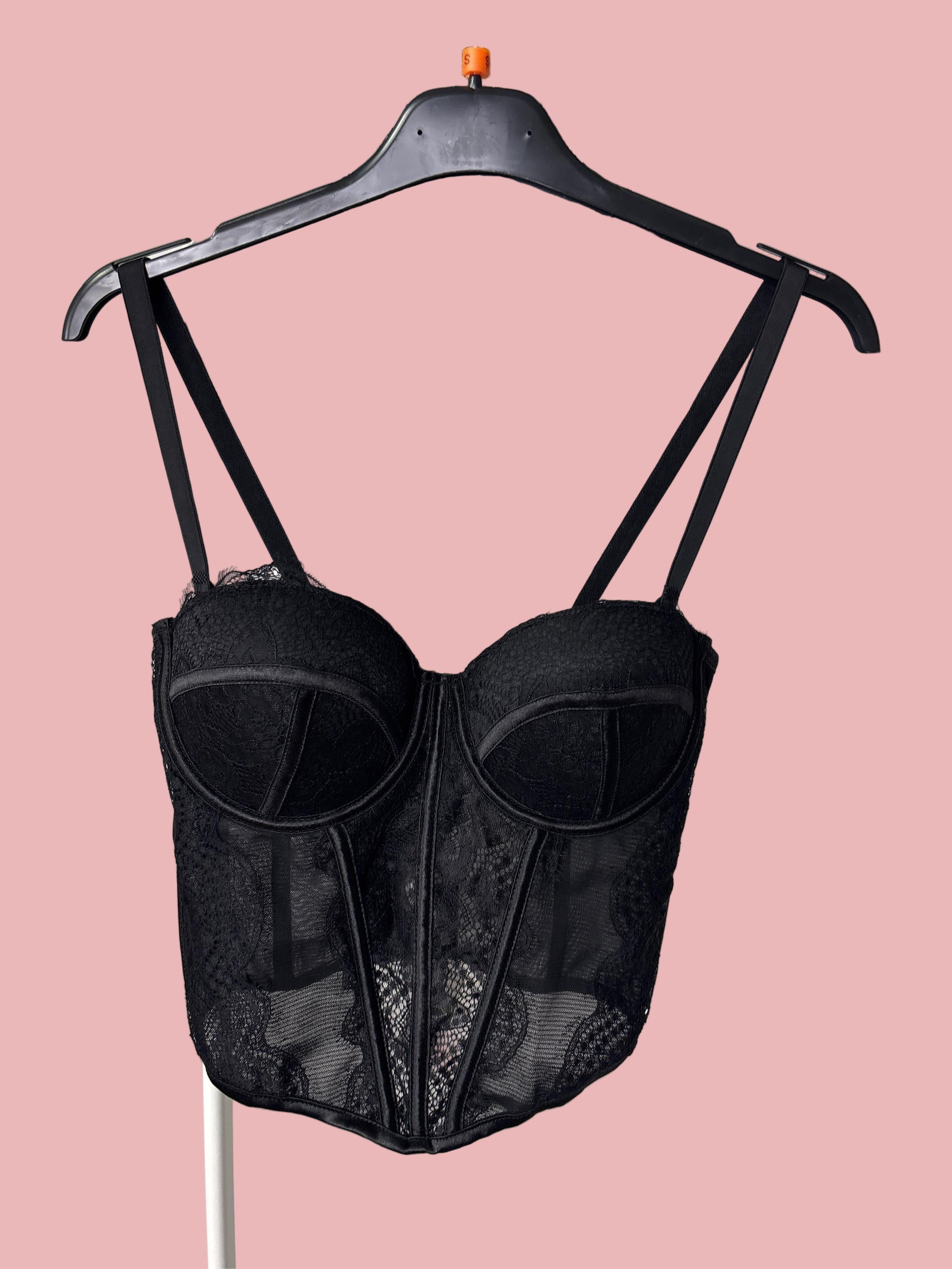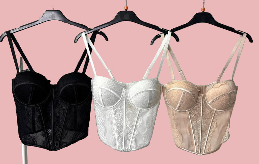 Corsetto strutturato con coppe imbottite e stecche modellanti che valorizzano la silhouette. Realizzato in pizzo stretch con dettagli satinati e doppie spalline regolabili. Perfetto da indossare come top per outfit eleganti o sotto blazer e giacche per un look più sofisticato.