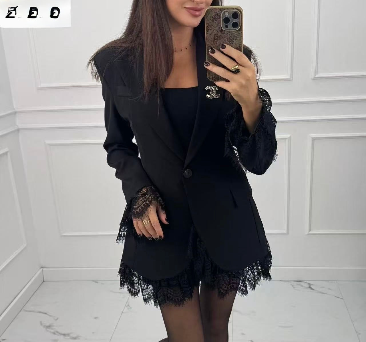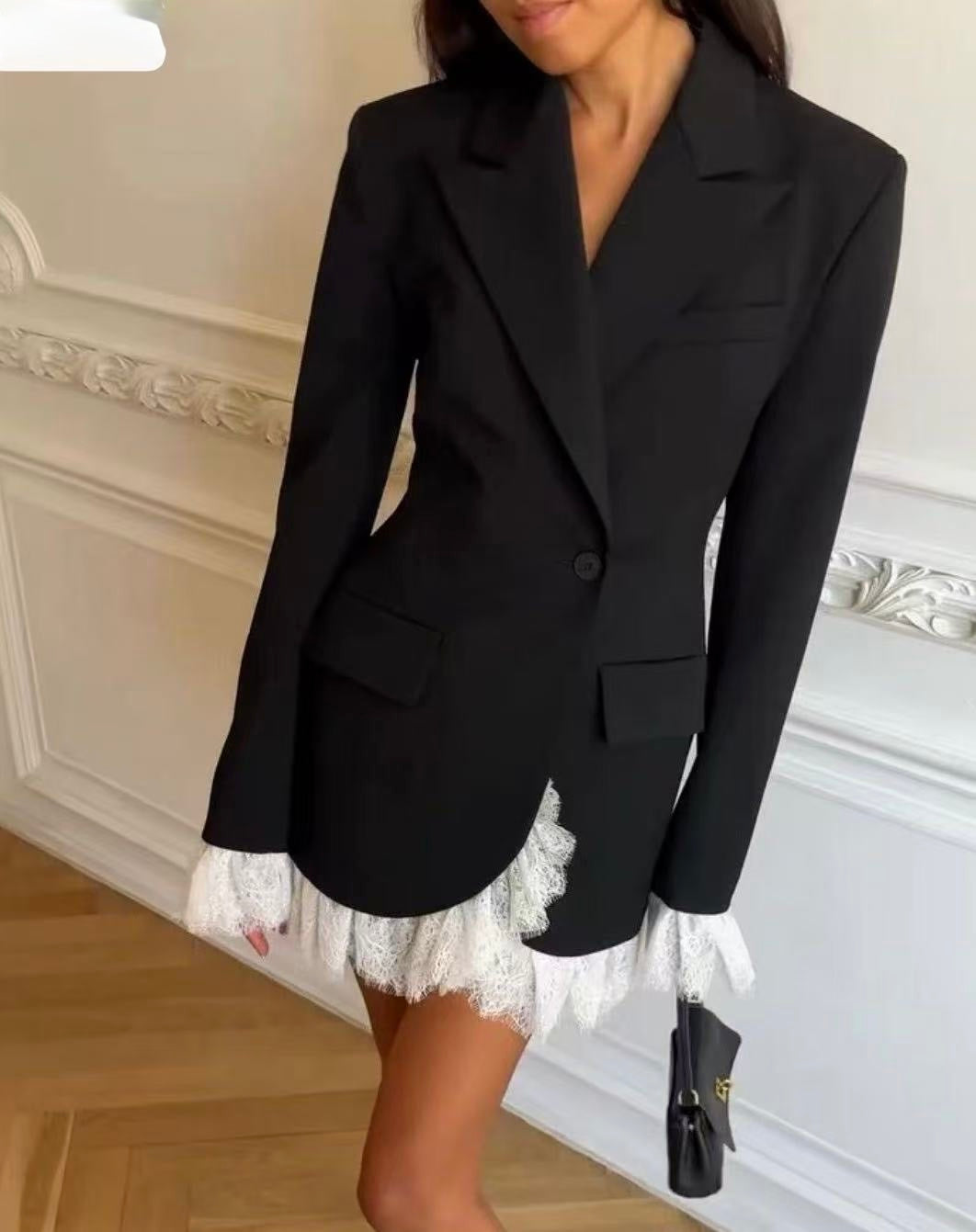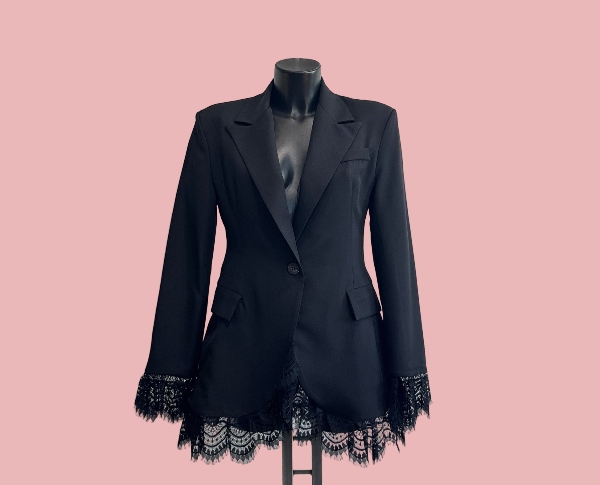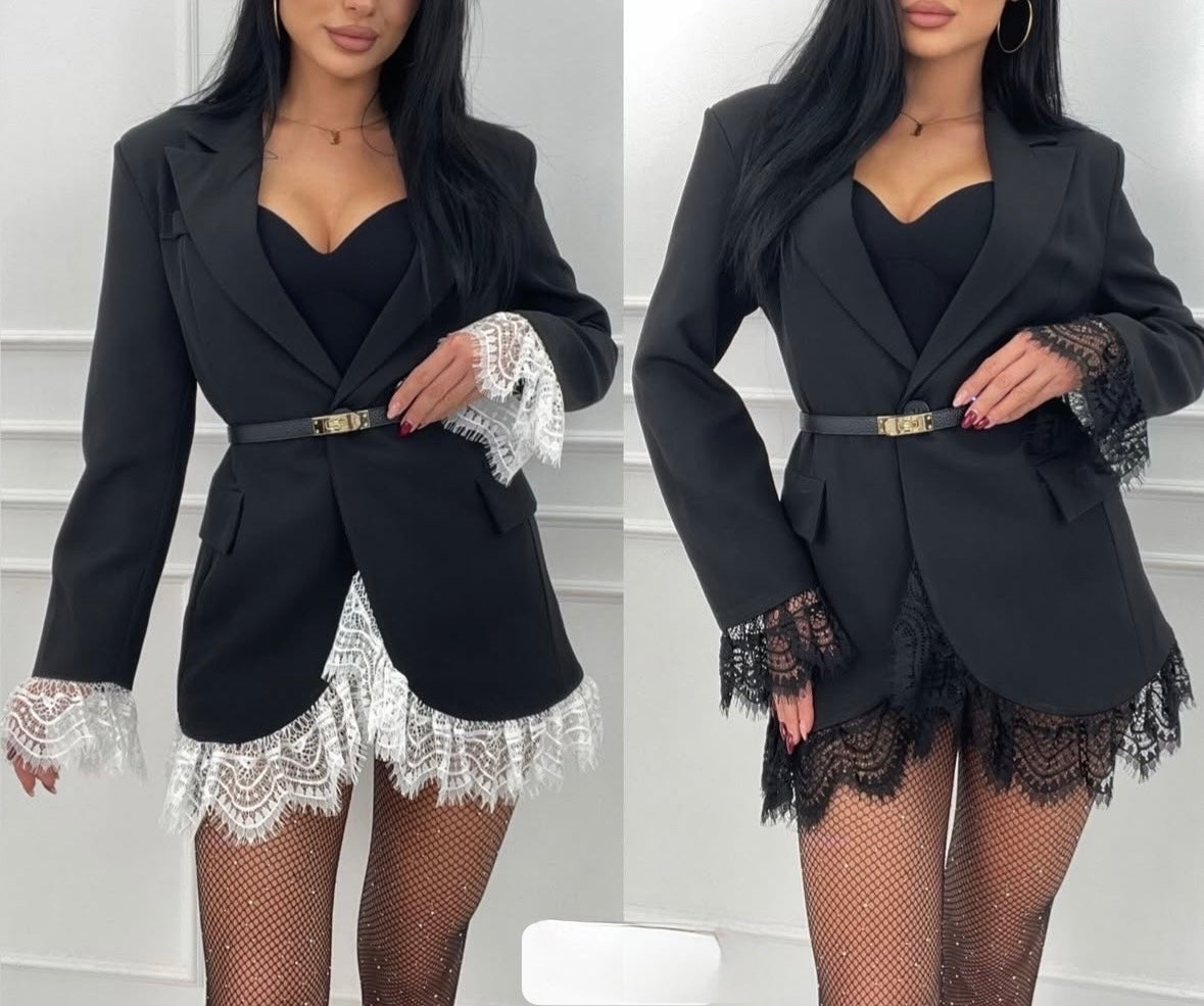 Blazer lungo in tessuto strutturato con inserto in pizzo sul fondo e ai polsi. La cintura in vita definisce la silhouette e trasforma il capo in un vero mini-dress elegante e sensuale. Perfetto da indossare con reggiseno/bustier a vista o come giacca sopra un look da sera.