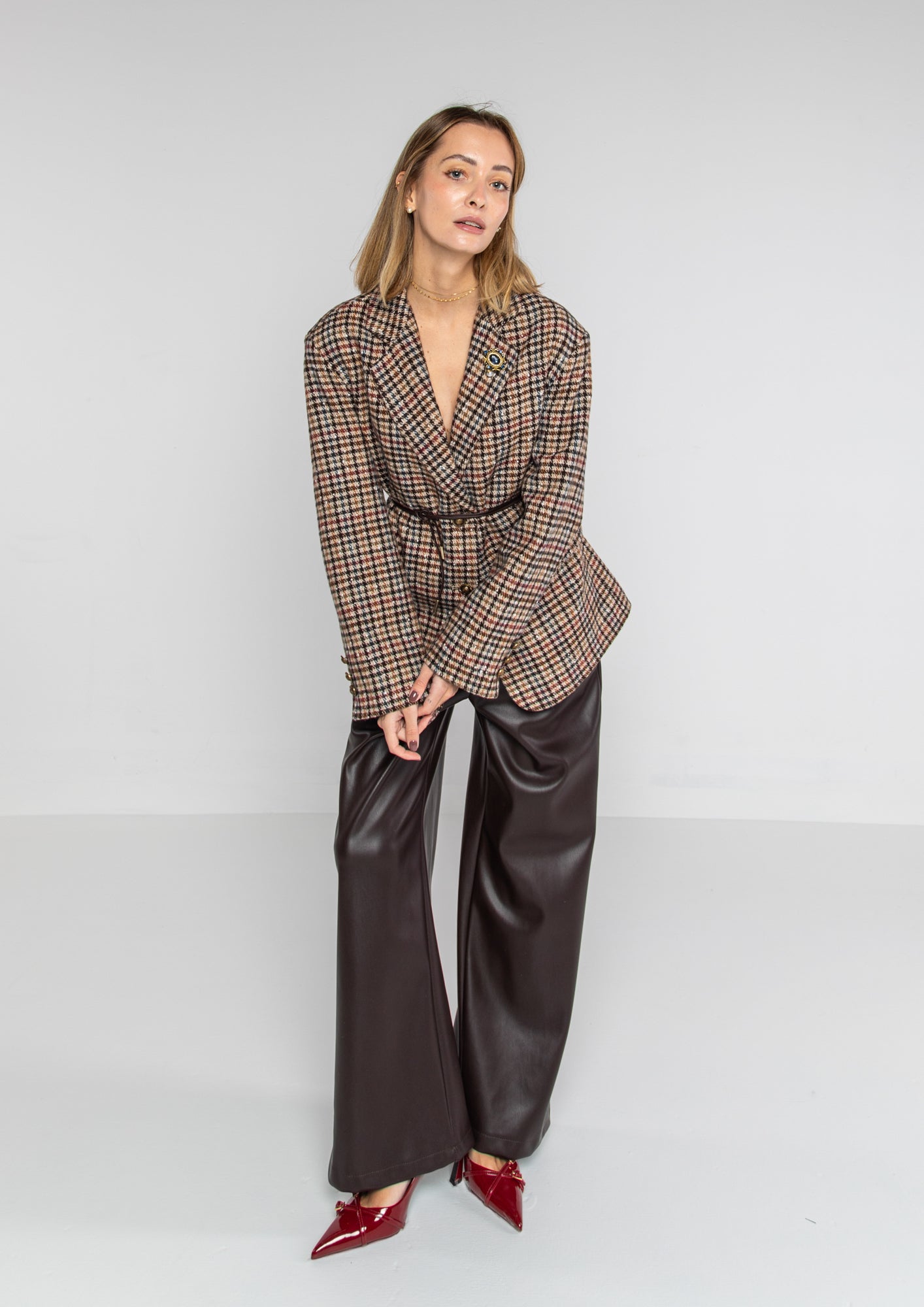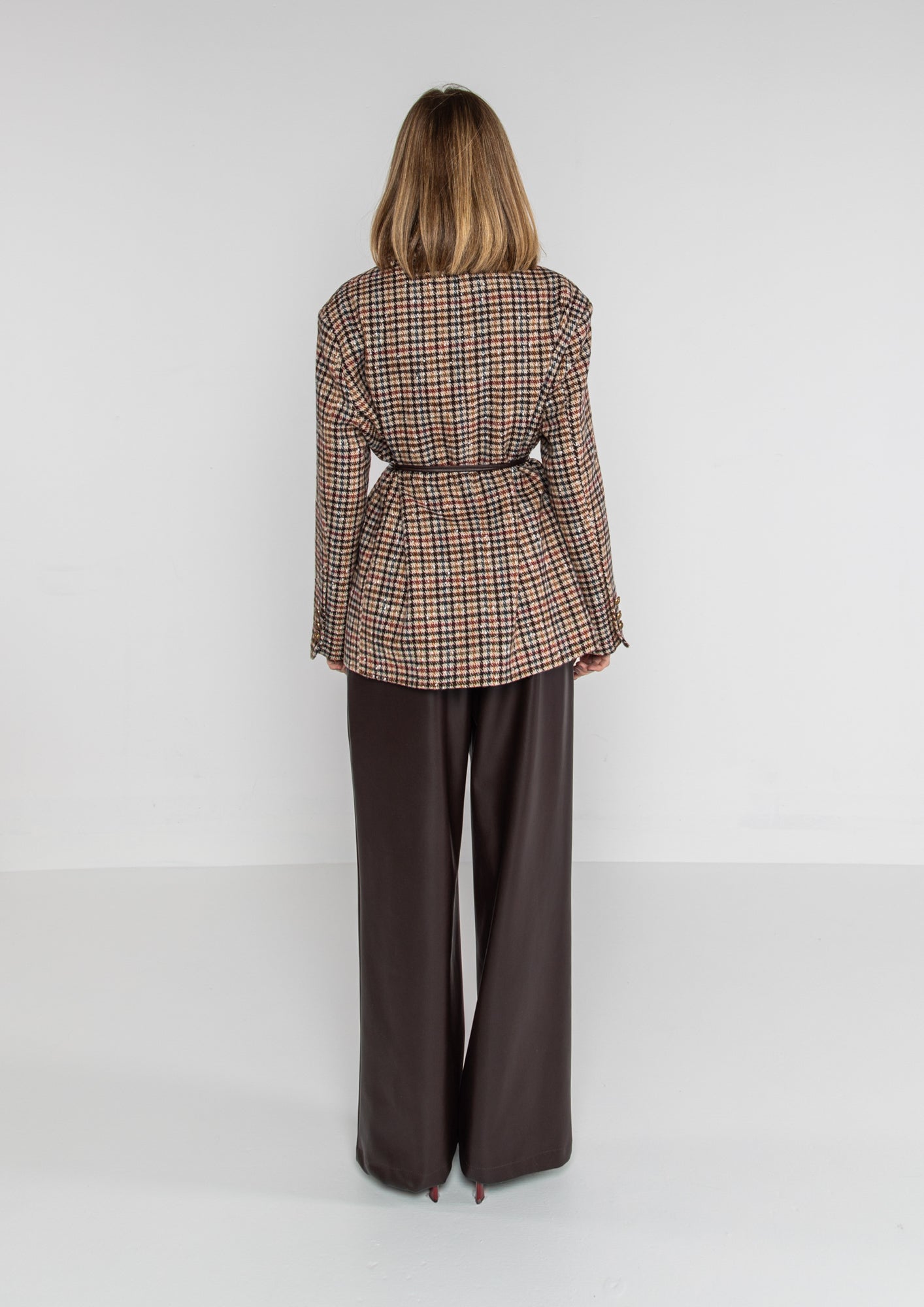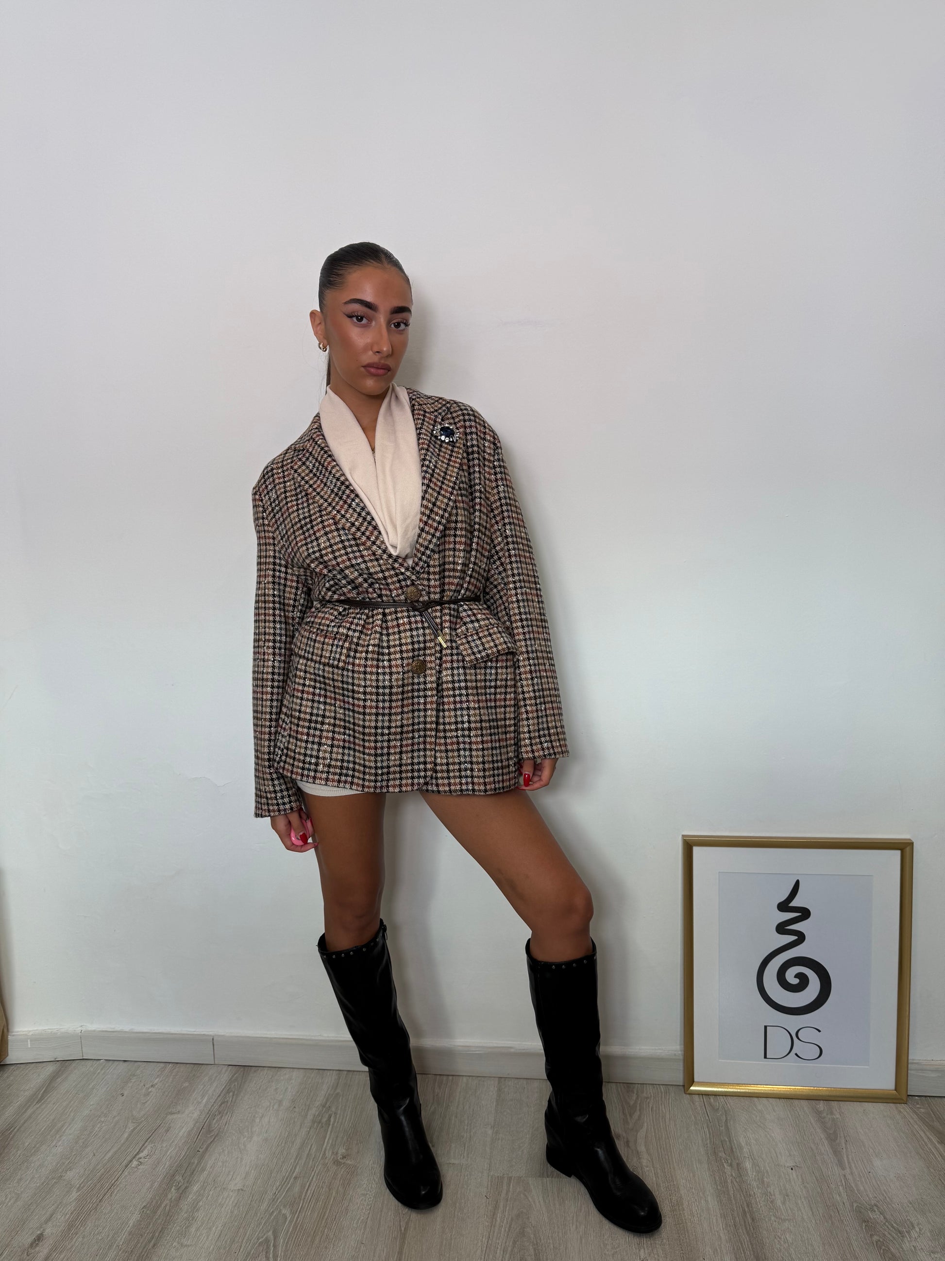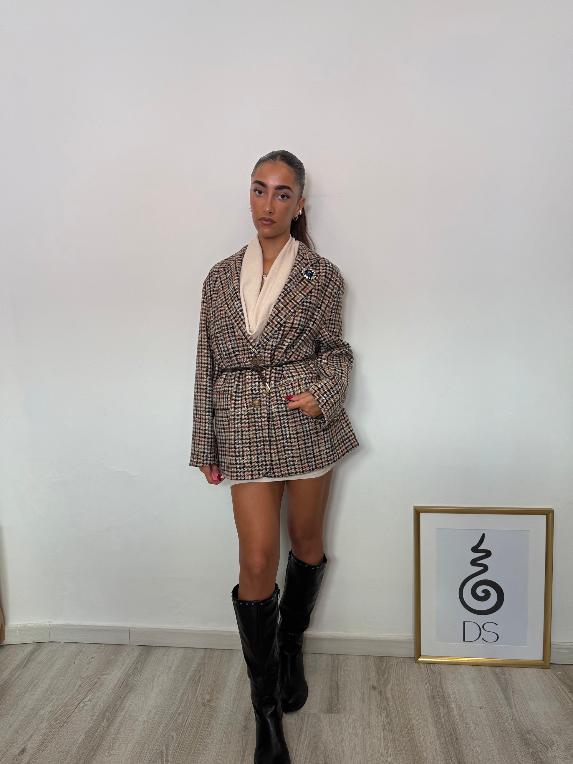 Giacca a motivi, spilla brillante sul colletto, foderata e con cinturino in vita in simil pelle rimovibile.
