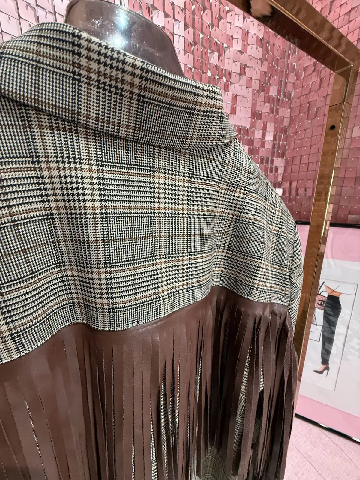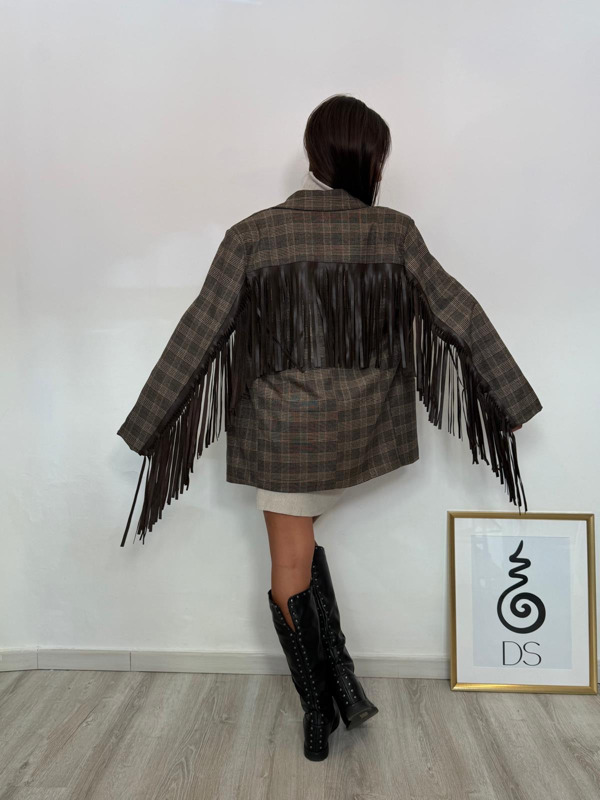 Blazer Oversize con collo a revers & frange in ecopelle sul retro e lungo la manica. Chiusura frontale con 1 bottone con spalline leggermente imbottite. Tasche frontali a filetto. Vestibilità Ottima.