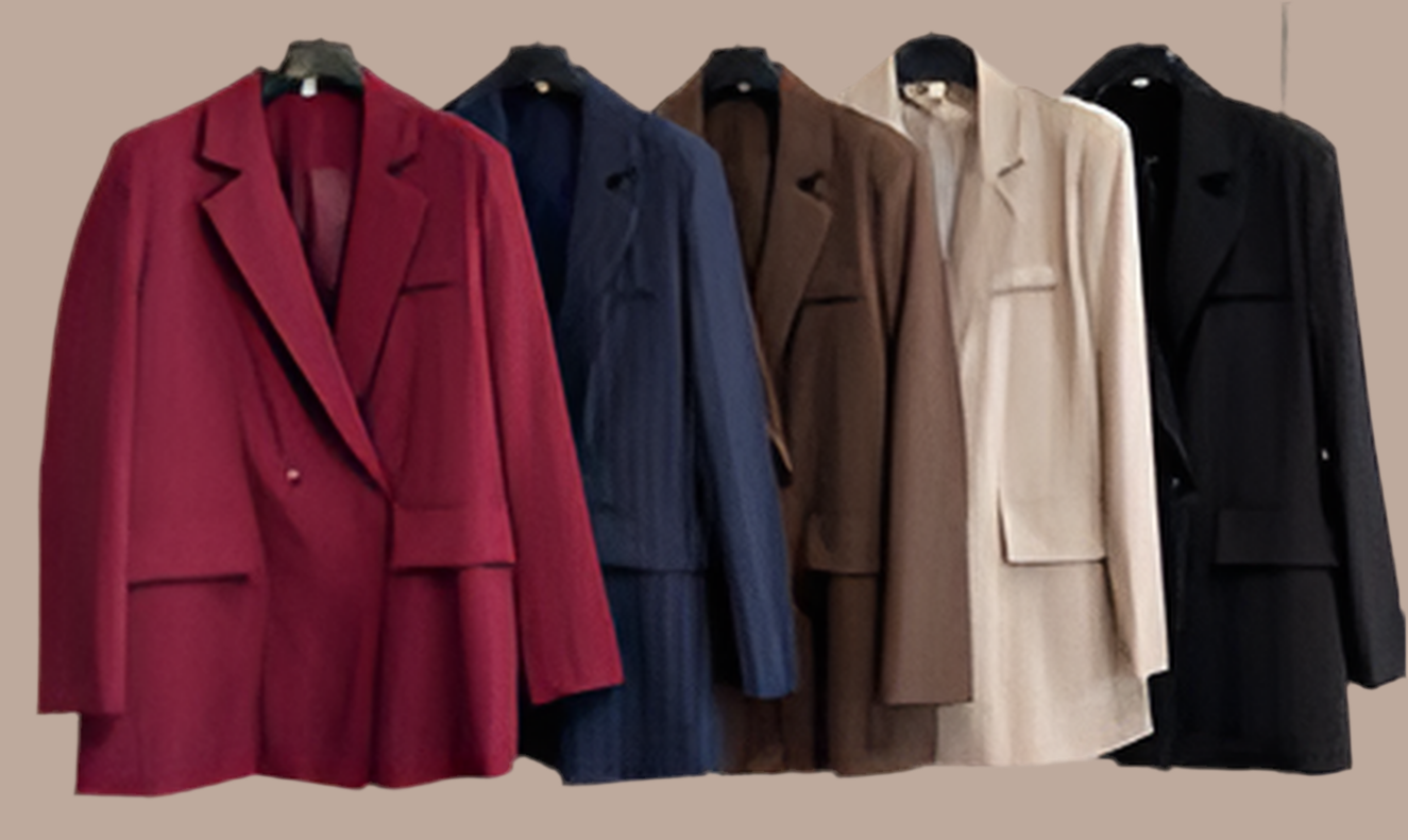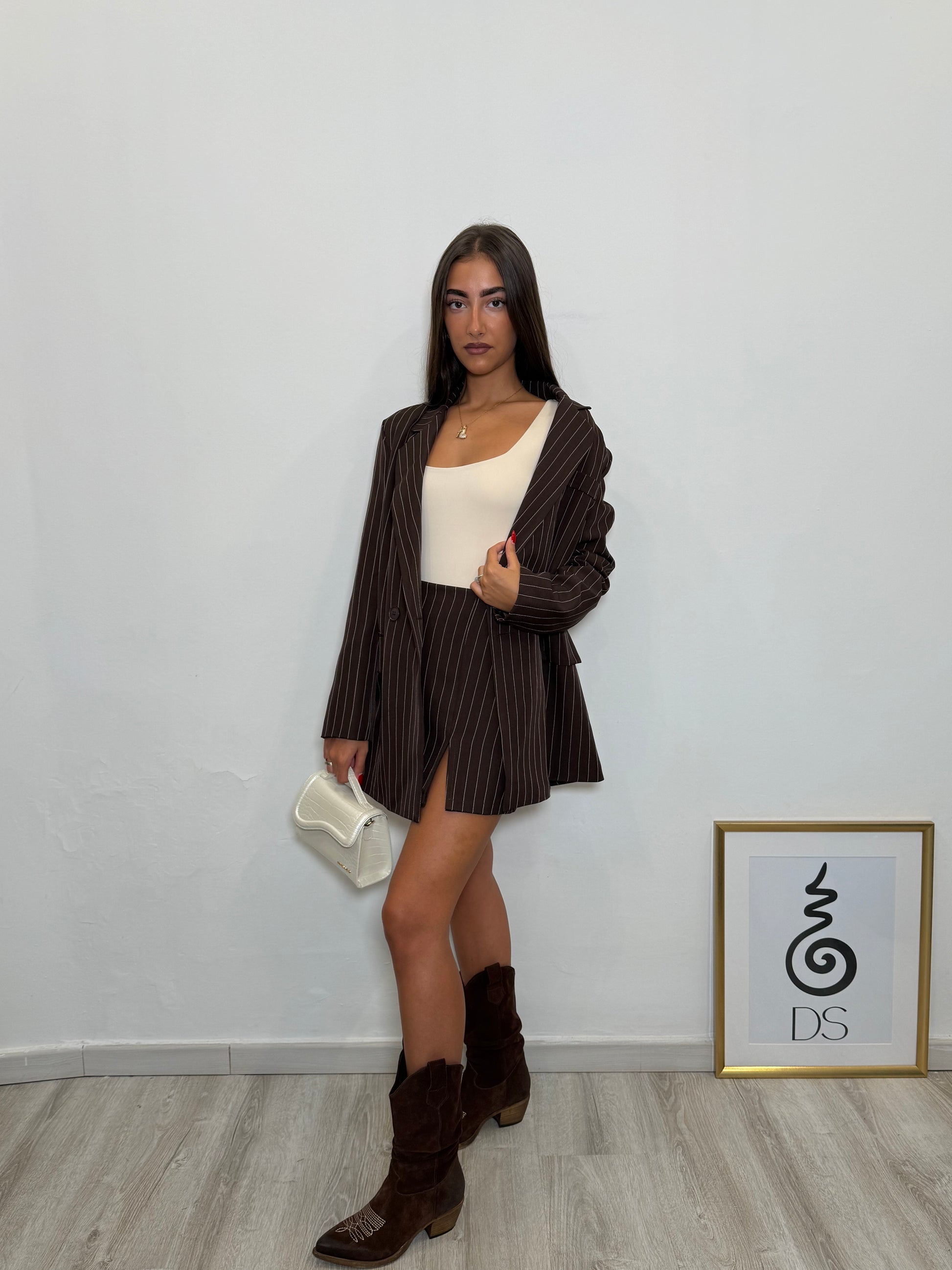 Giacca gessata con taglio over, doppio petto, con spalline imbottite e collo a reverse.