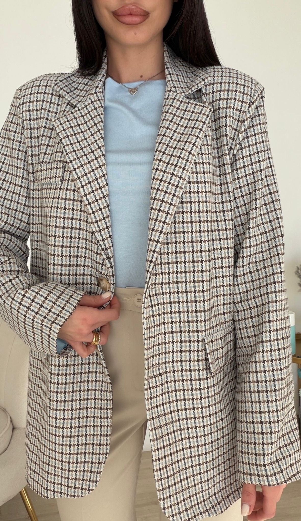 Blazer monopetto dal taglio sartoriale con vestibilità regolare e linea pulita. Realizzato in tessuto fantasia pied-de-poule nelle tonalità rosa e neutre, presenta rever classico, chiusura frontale con bottone e tasche applicate. Struttura leggera e confortevole, ideale per completare look eleganti o casual.