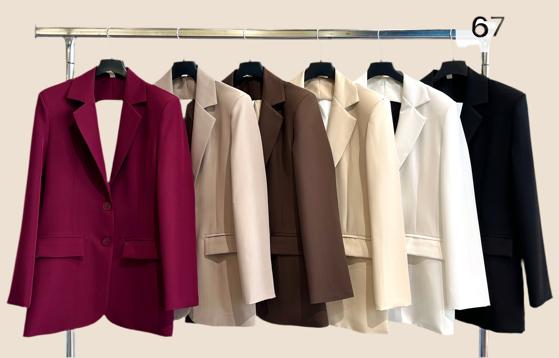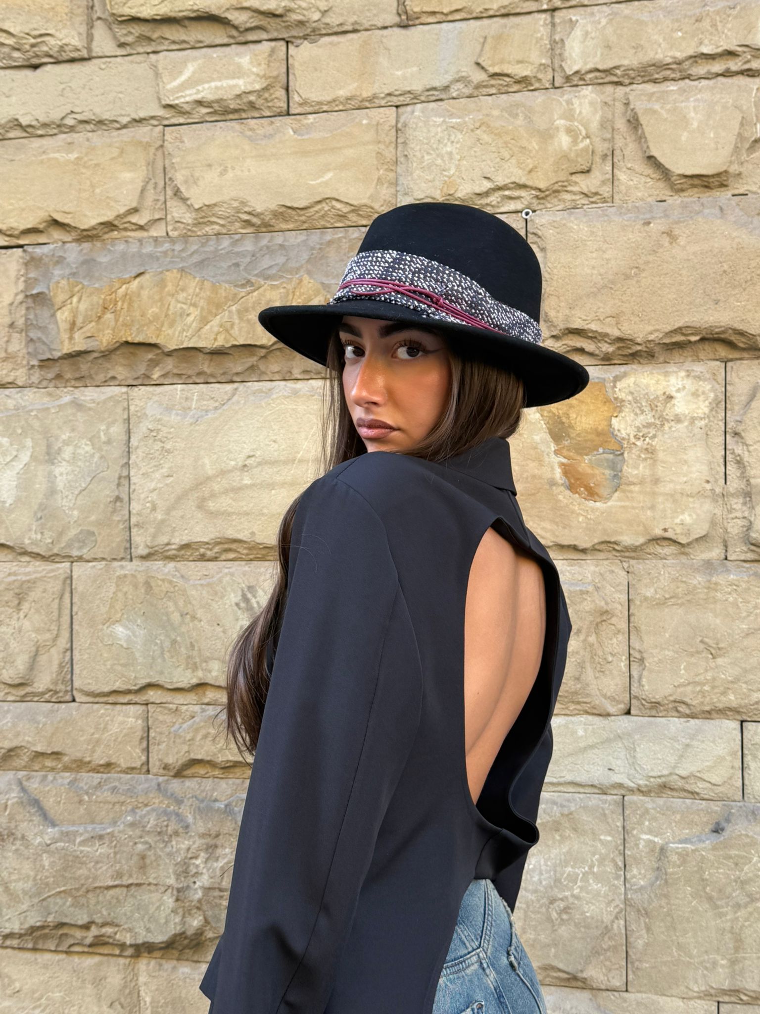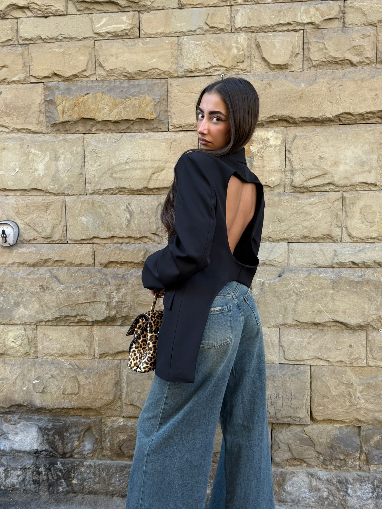 Giacca con schiena completamente scoperta e colletto classico. Caratterizzata da una linea morbida e leggermente over, presenta maniche lunghe con polsini abbottonati e chiusura frontale con bottoni ri-vestiti.
