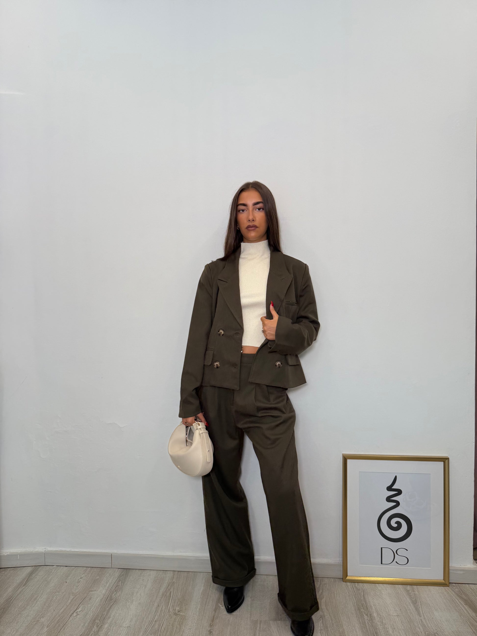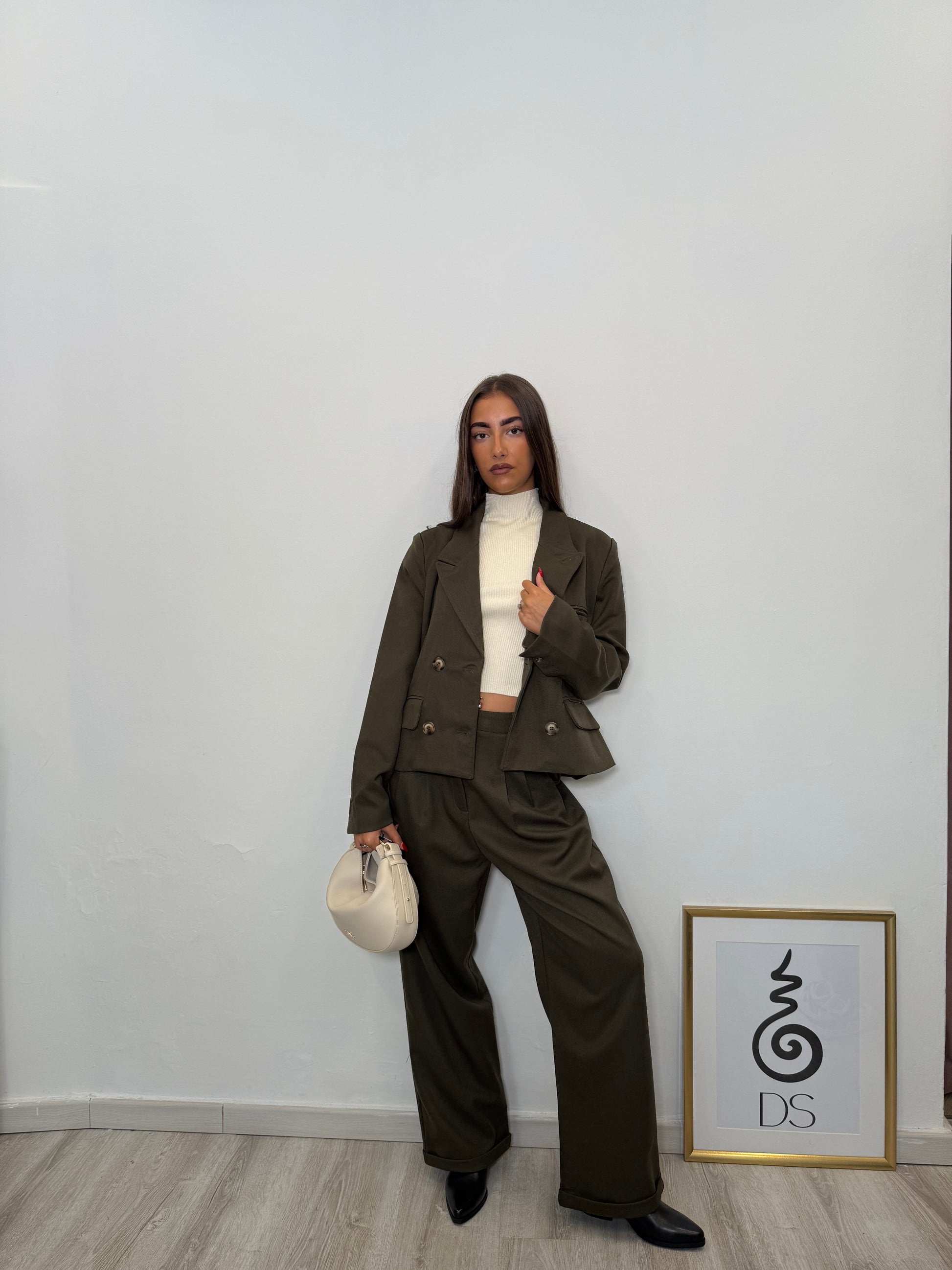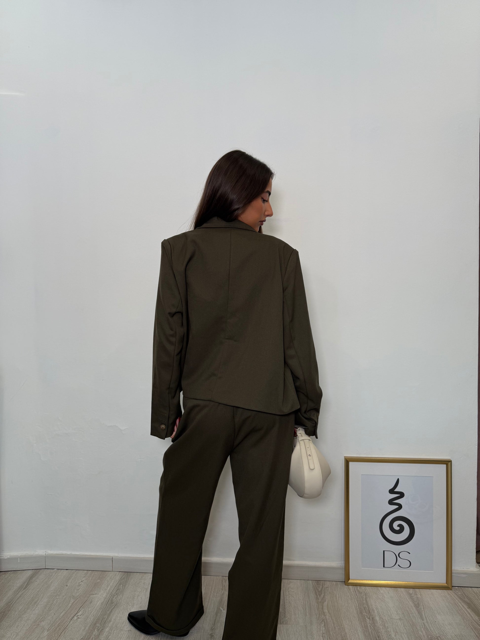 Giacca Verde Oliva doppiopetto con tasche frontali.