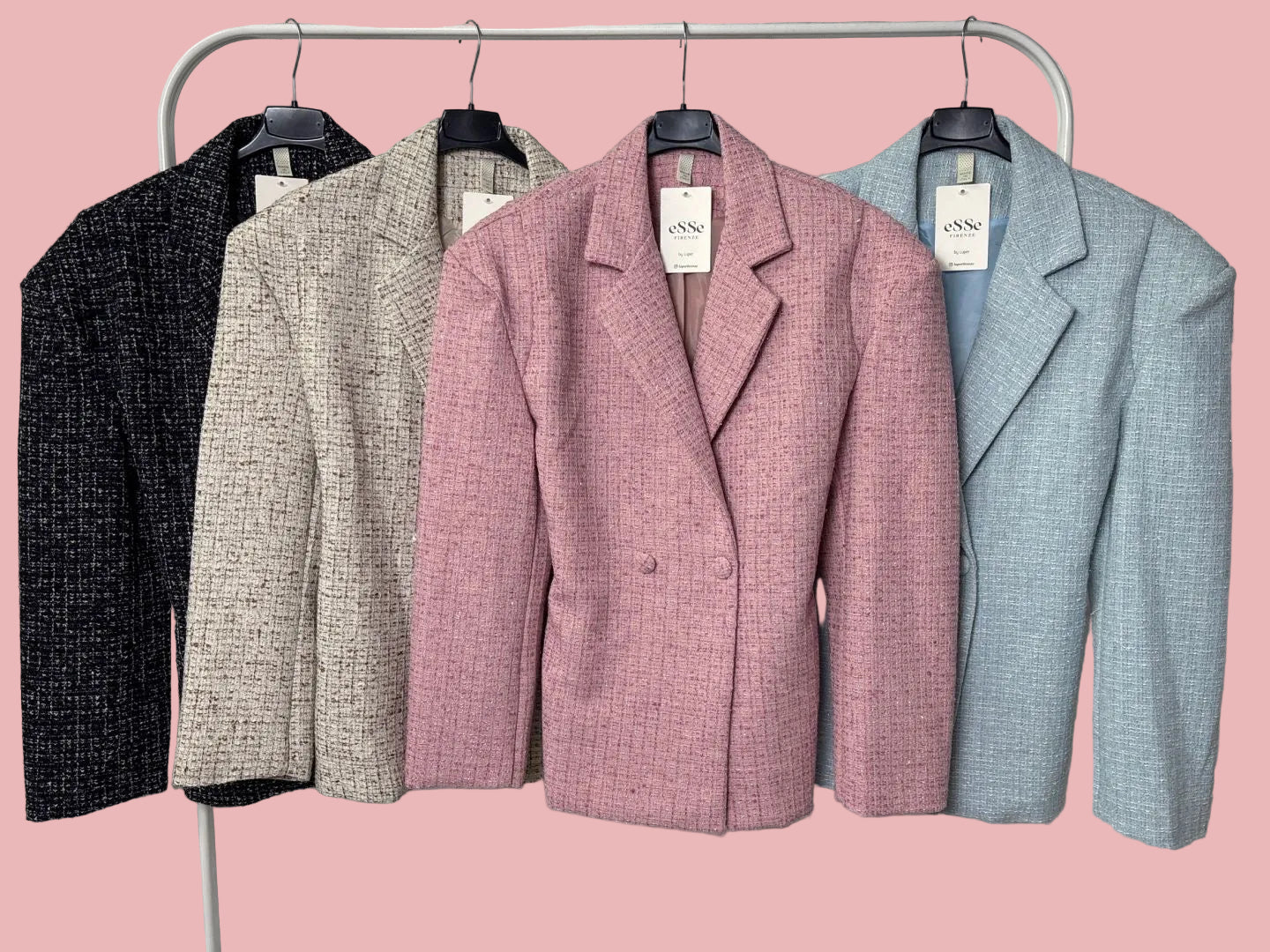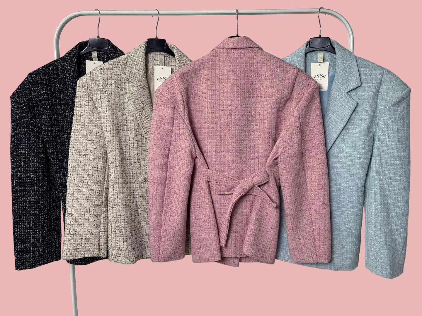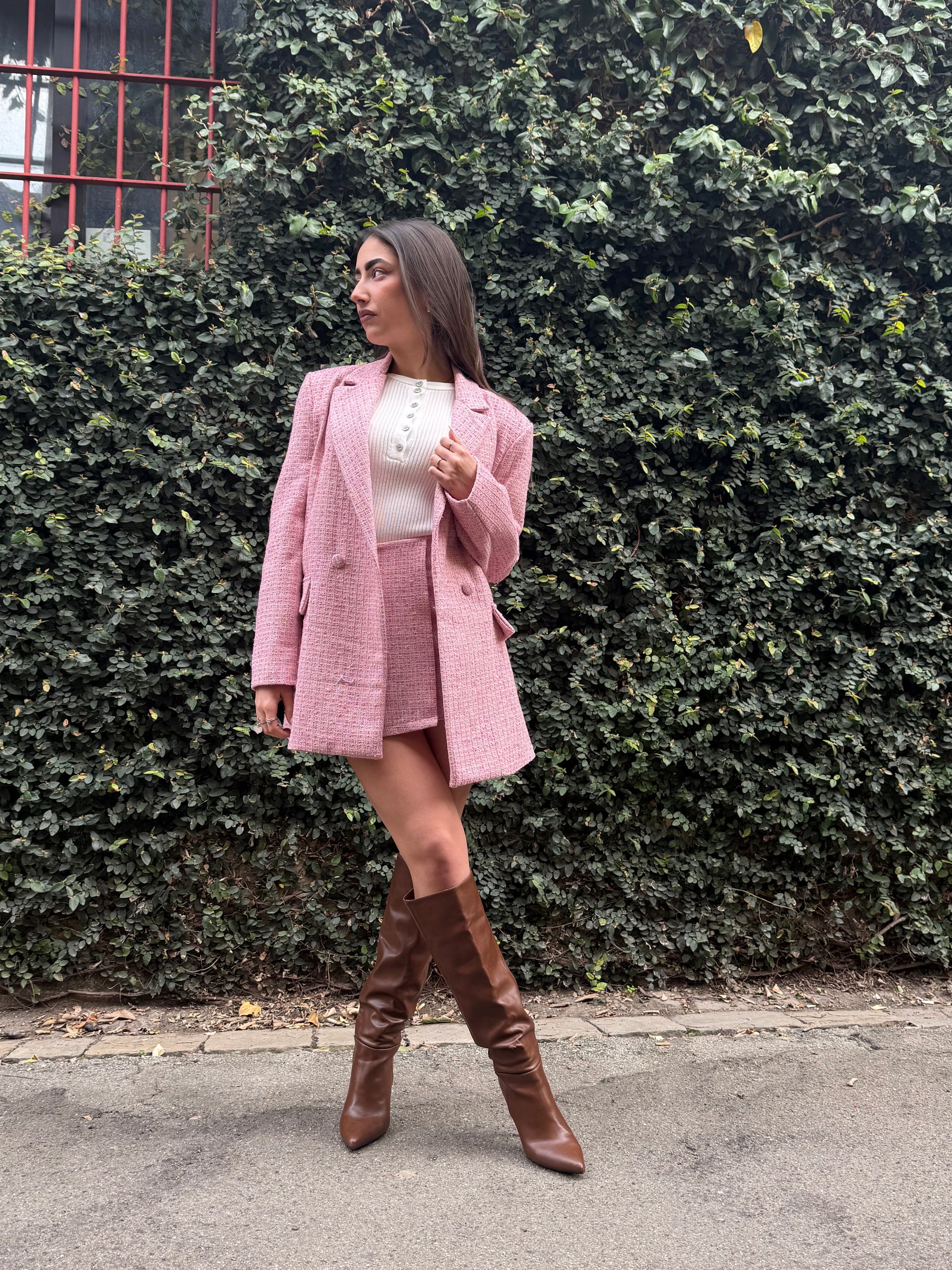Giacca in tessuto bouclé strutturato con vestibilità regolare e linea leggermente sagomata. Presenta rever classico, chiusura frontale con bottoni rivestiti e cintura coordinata removibile sul retro che valorizza la silhouette. Struttura leggera e caduta elegante, perfetta anche in coordinato.