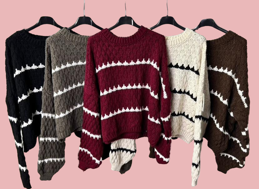 Maglione in maglia intrecciata con motivo a righe orizzontali a contrasto.