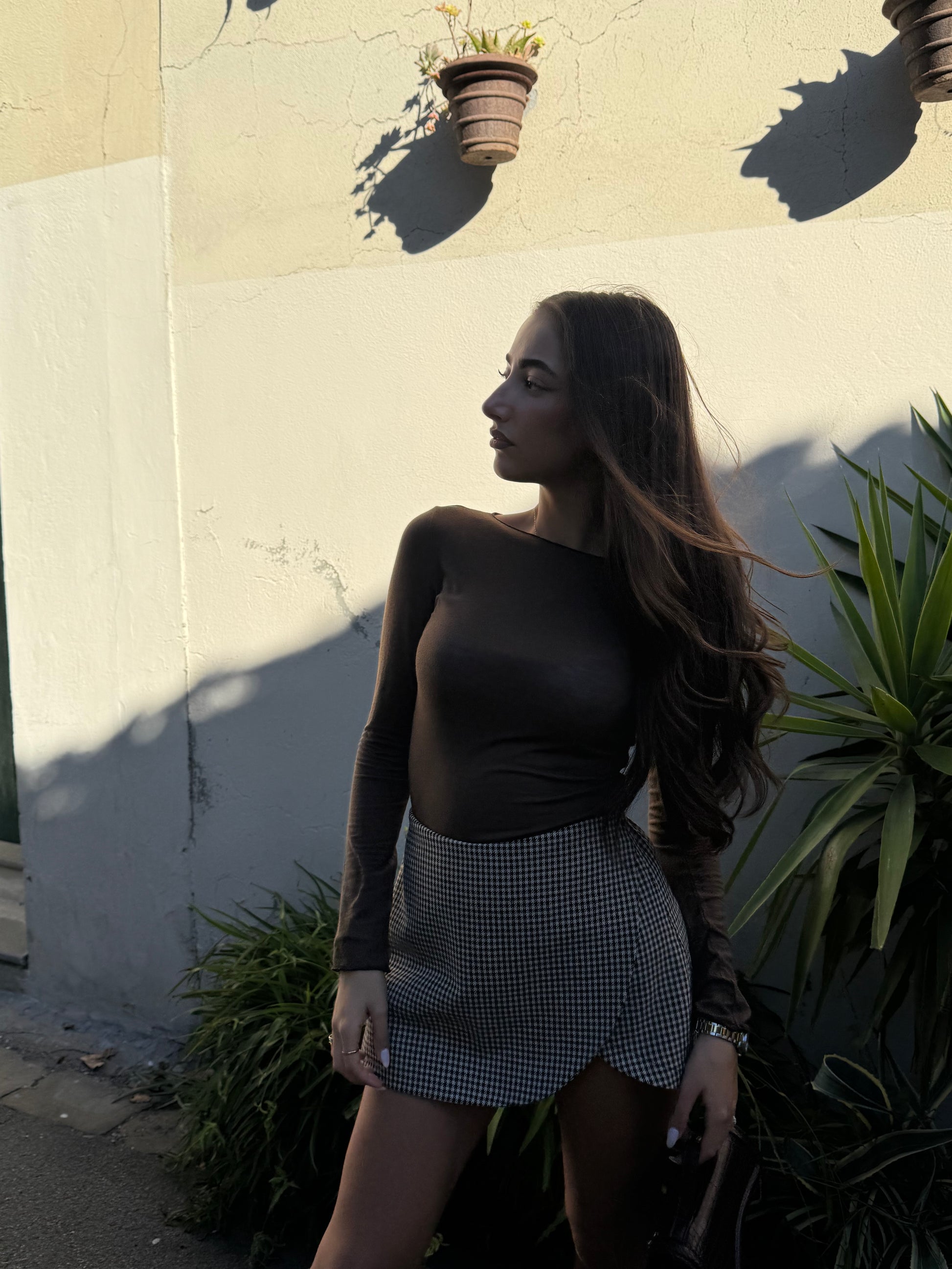 La mini gonna, fantasia micro pied-de-poule dal taglio dritto, valorizza la silhouette e si chiude con zip laterale invisibile. Un look versatile, perfetto da abbinare a top basici o camicie per creare outfit chic da giorno o da sera.