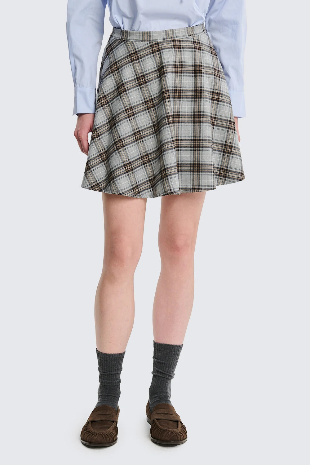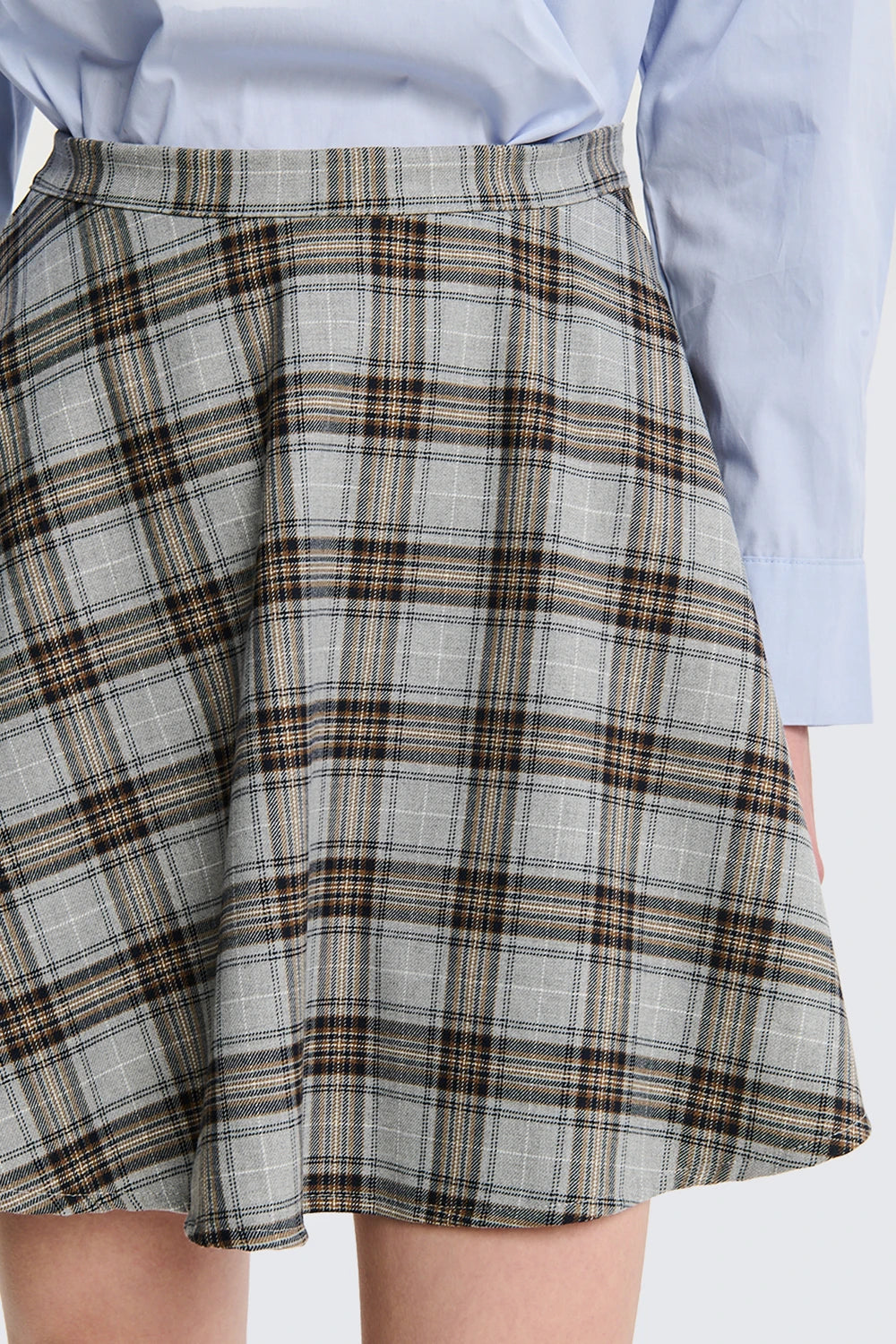 Gonna corta check a ruota, cerniera in vita. Vestibilità comoda.