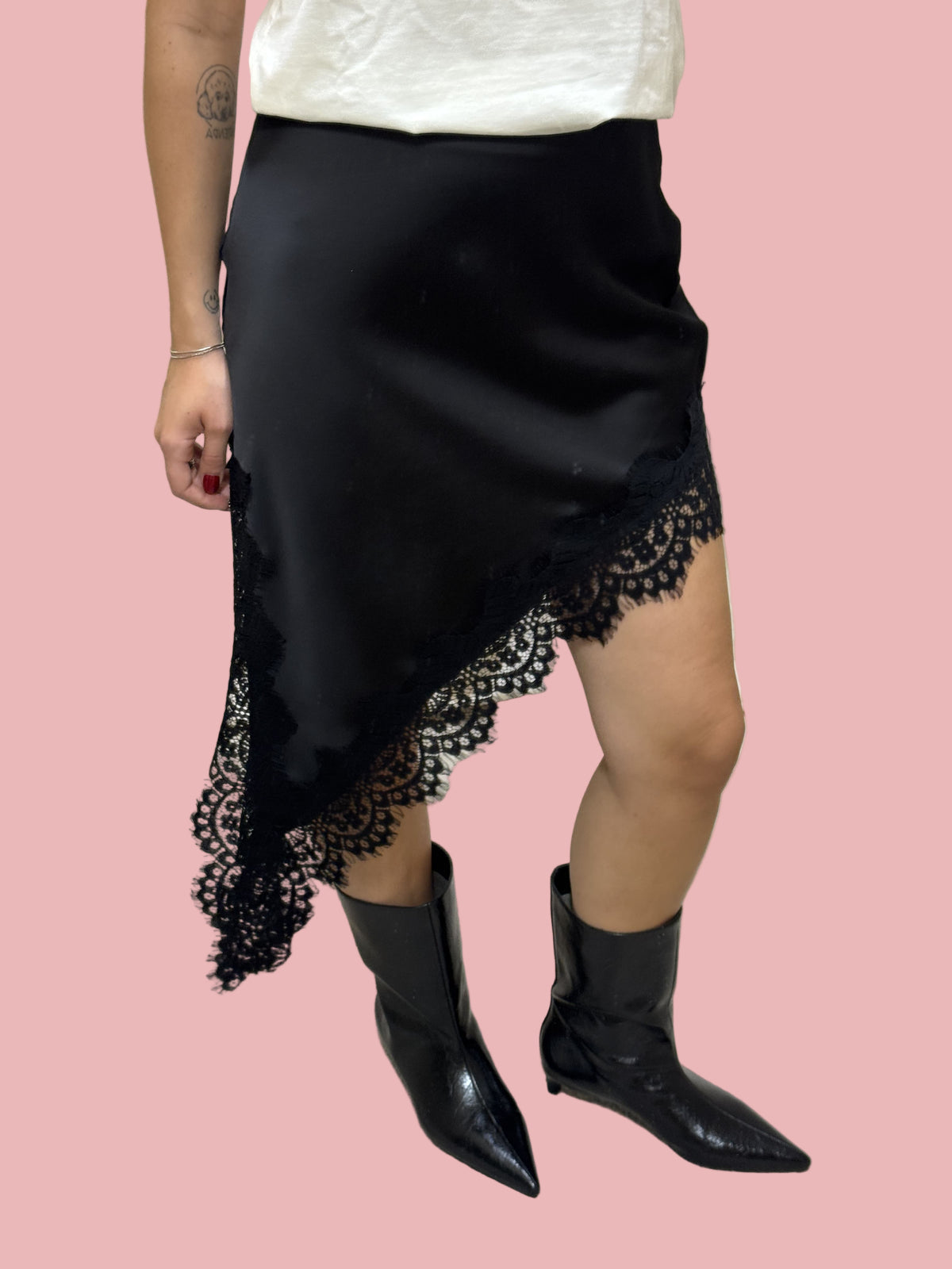Gonna asimmetrica in satin con spacco laterale, rifinitura in pizzo a contrasto, elastico in vita.