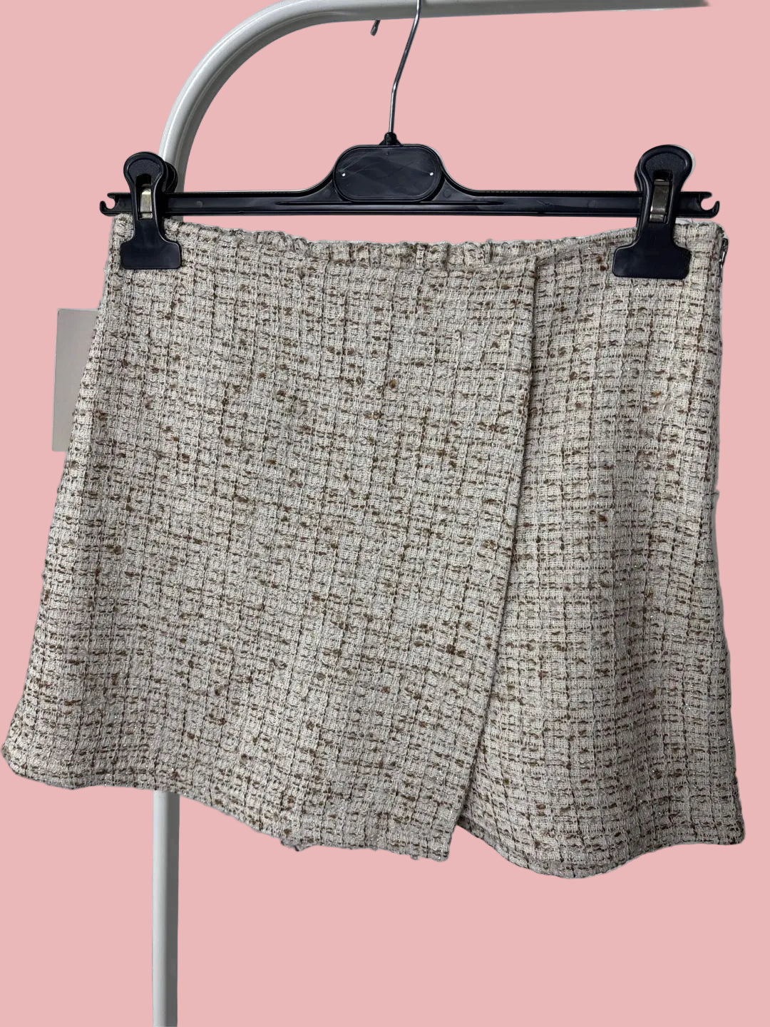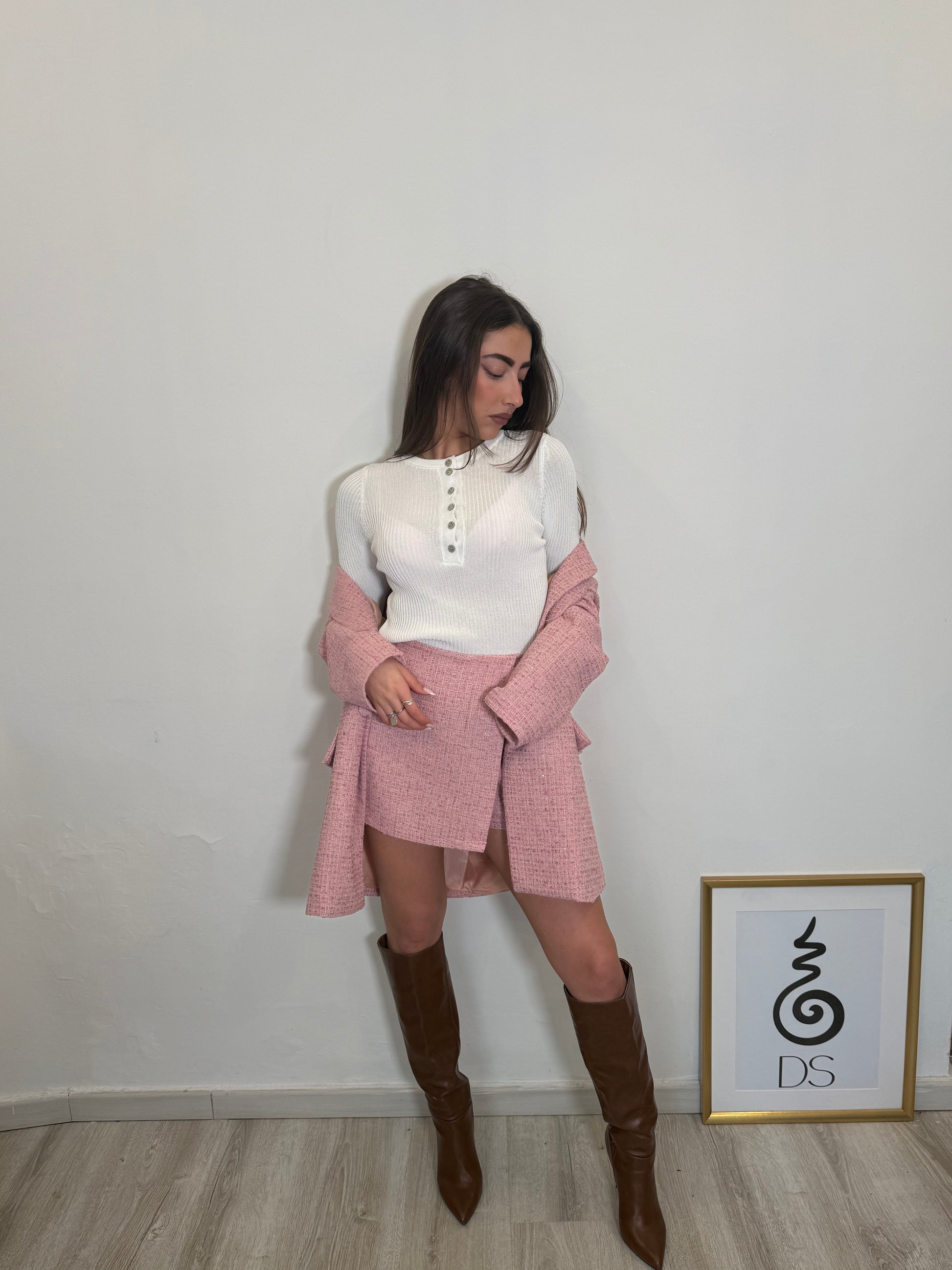 Gonna corta realizzata in tessuto bouclé coordinato, con linea pulita e vestibilità regolare. Presenta vita strutturata e chiusura discreta, garantendo comfort e una vestibilità femminile. Perfetta da indossare con la giacca abbinata o separatamente.