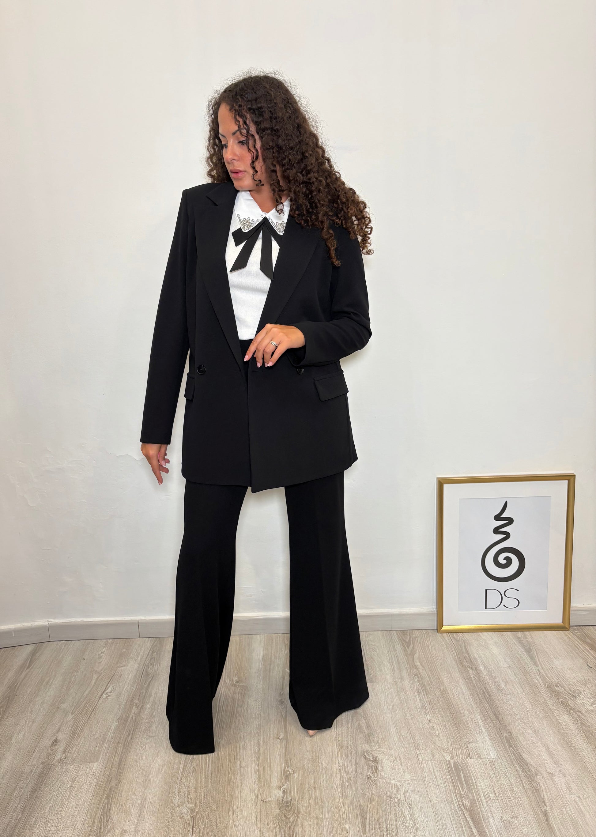 Maglia in filo elasticizzati con manica a sbuffo. Collo in tessuto camicia con applicazione di strass crystall e fiocco in contrasto. Bottone dietro. Taglia unica con vestibilità fino ad una M.