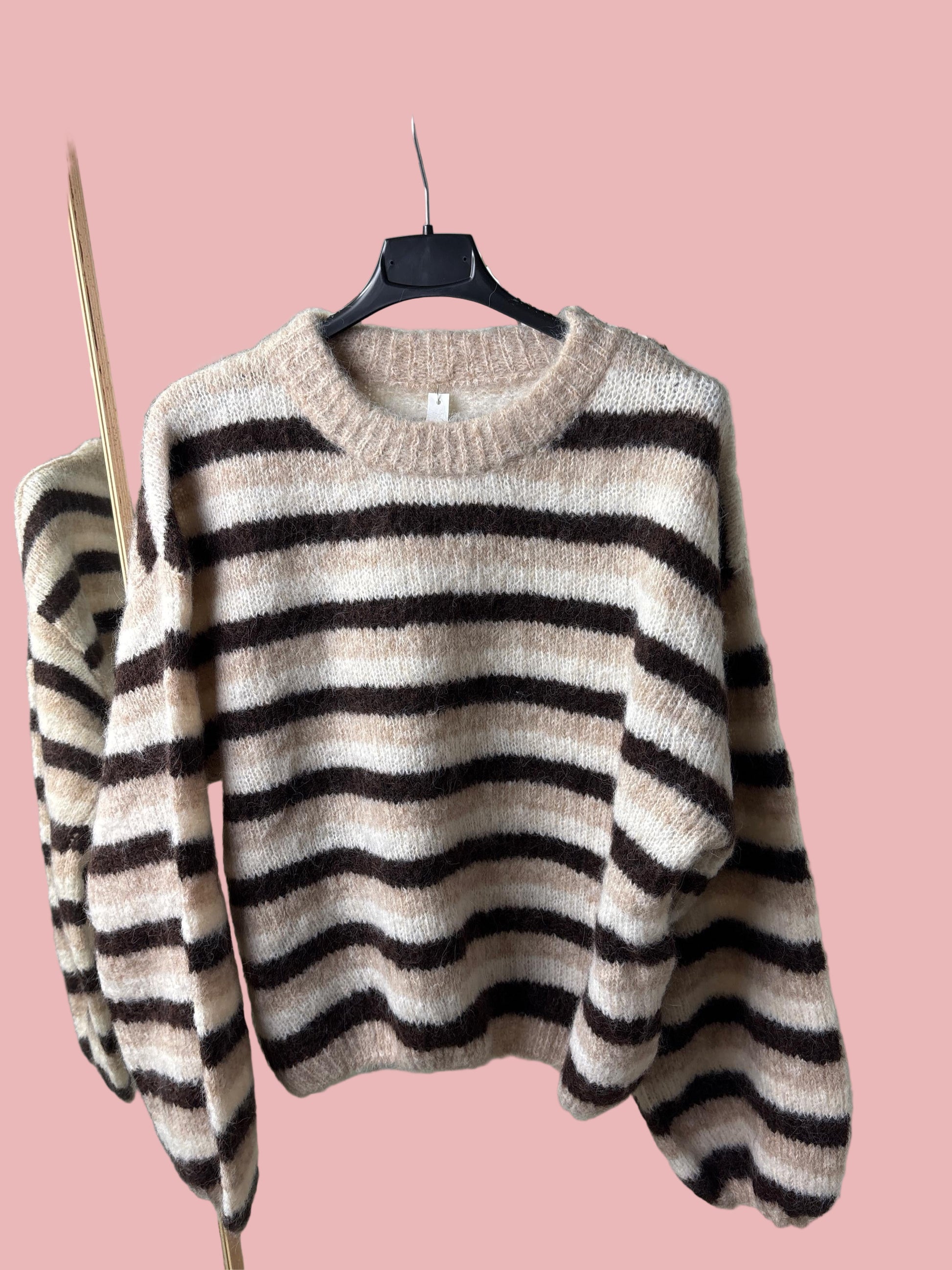 Morbido, caldo e leggerissimo. Maglione a righe nei toni neutri beige e marrone, dal fit leggermente over e spalla scesa. Perfetto da abbinare a jeans, gonne o pantaloni in ecopelle per un look effortless ma curato.