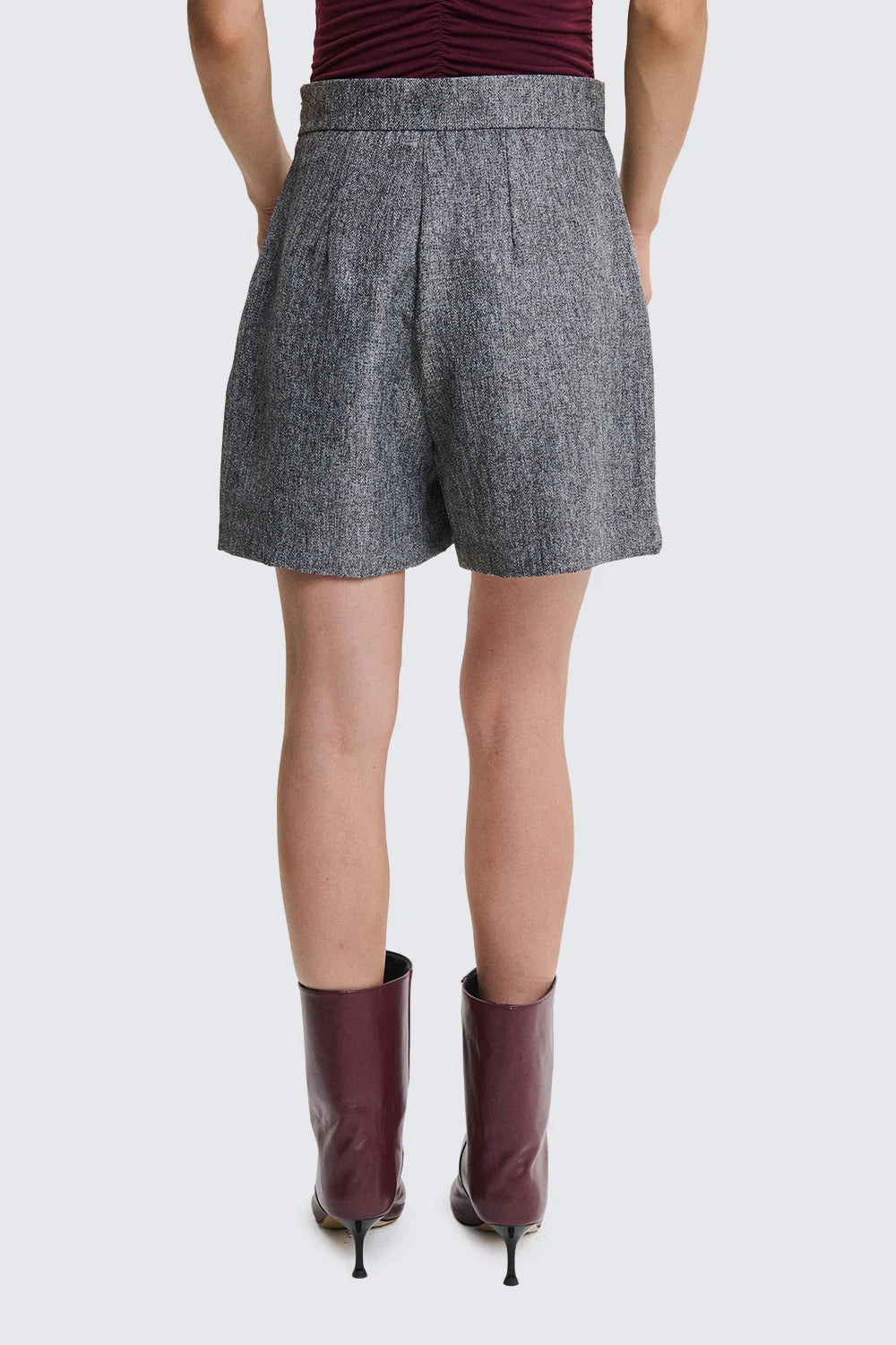 Chiusura con zip laterale modello pantaloncino con dettaglio pieghe, e cerniera a chiudere.