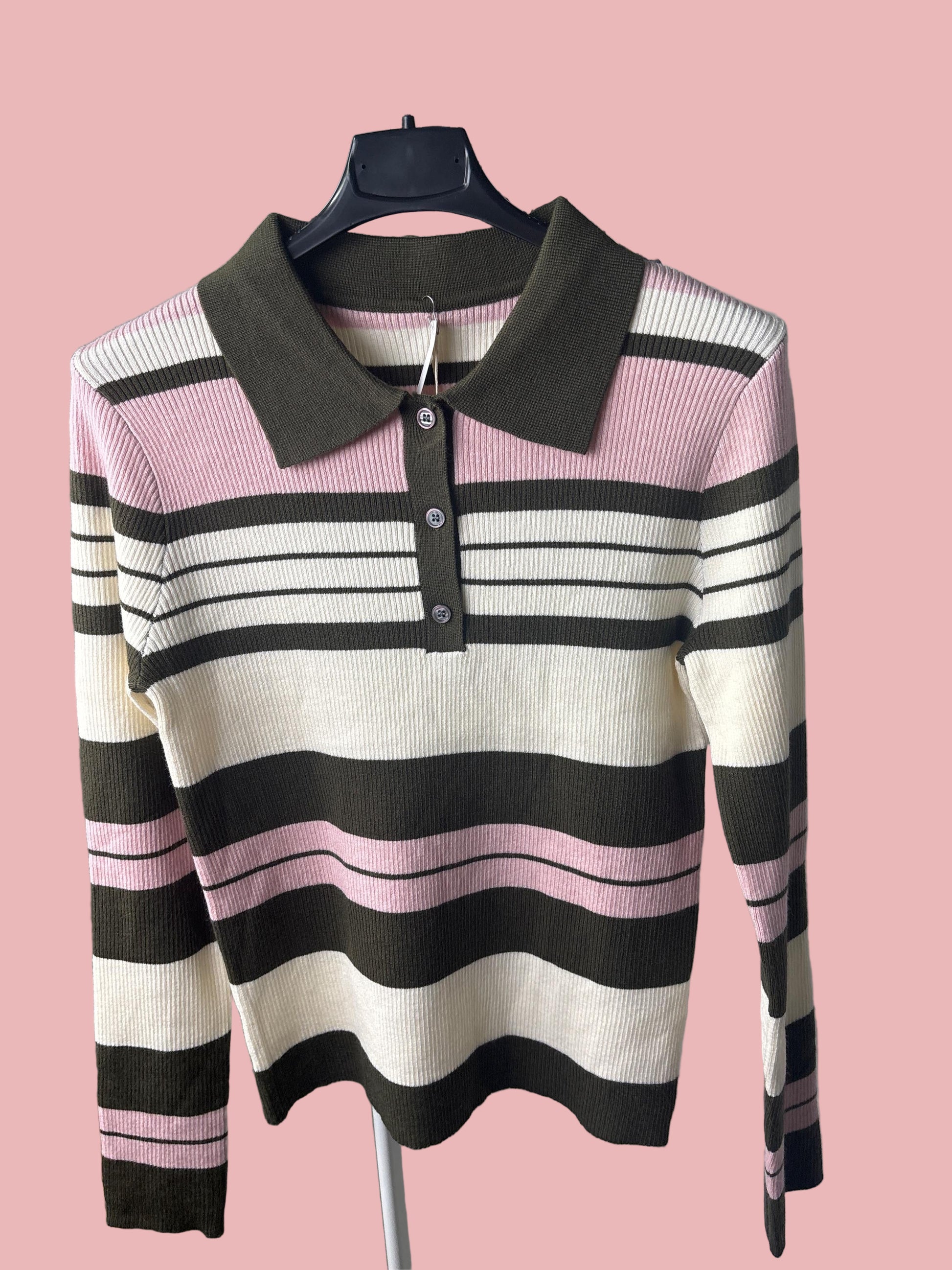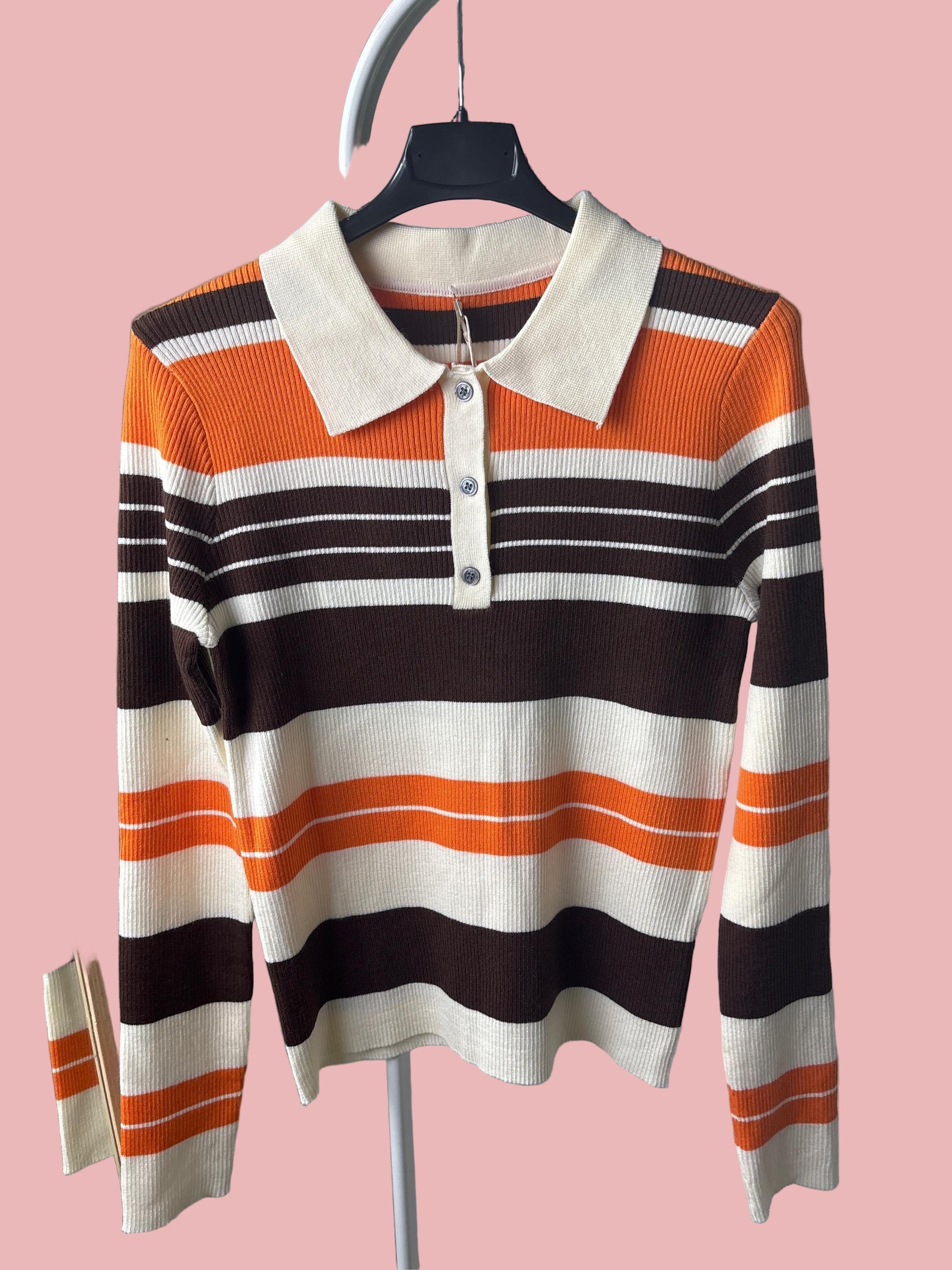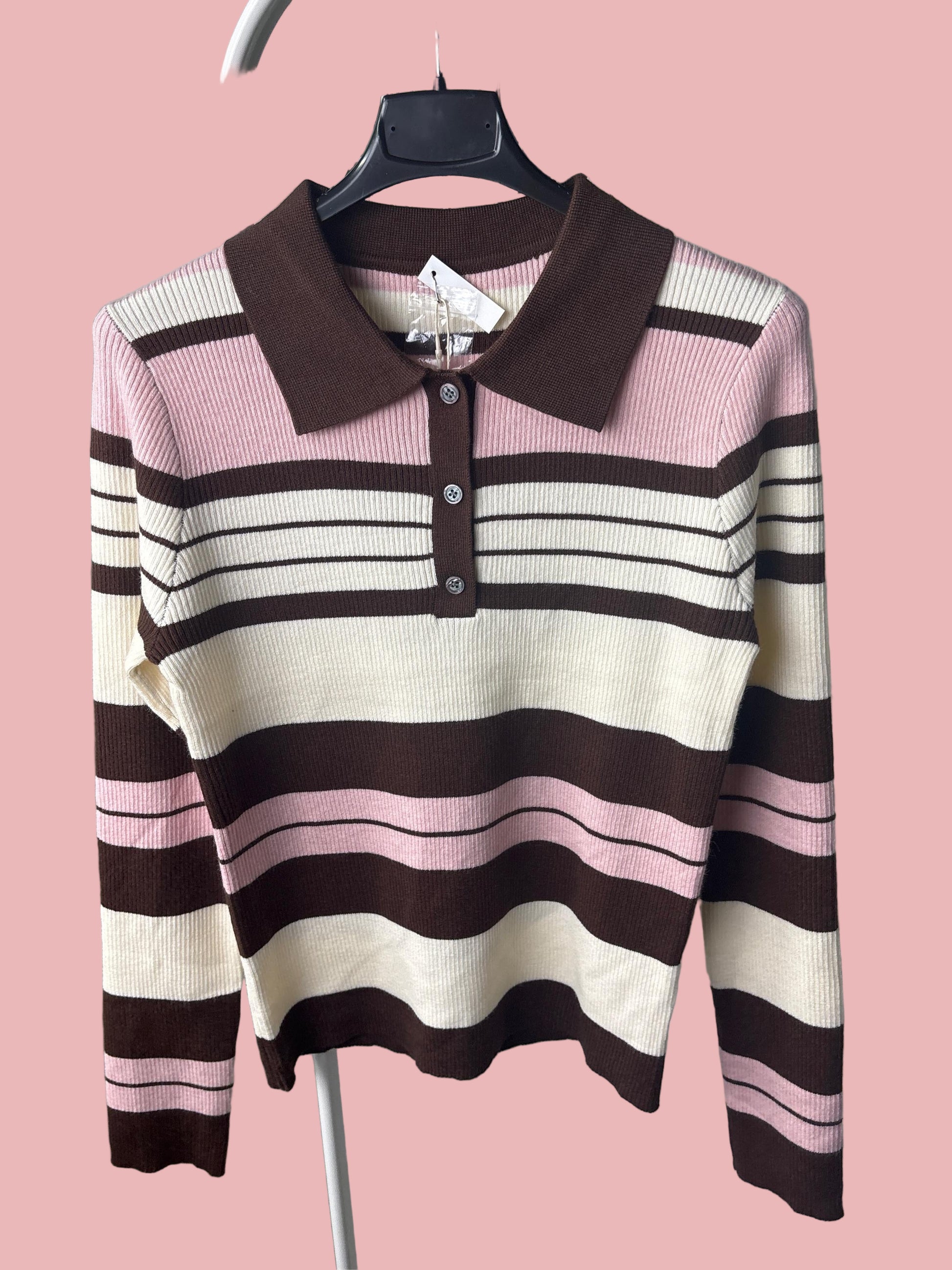 Maglia, modello Polo. Scollo a camicia e bottoni regolabili. Trama a righe, toni del grigio, bianco e rosso. Aderente. Rifiniture finali a costine. Colore base marrone