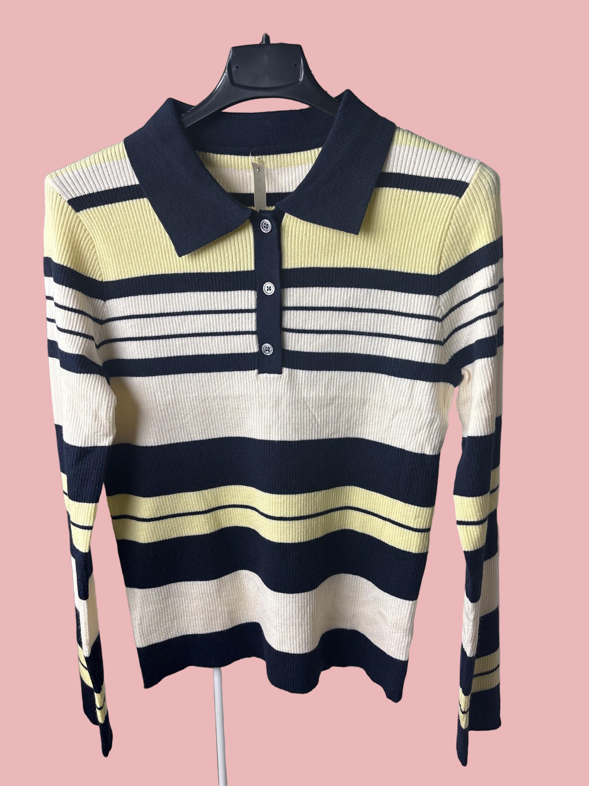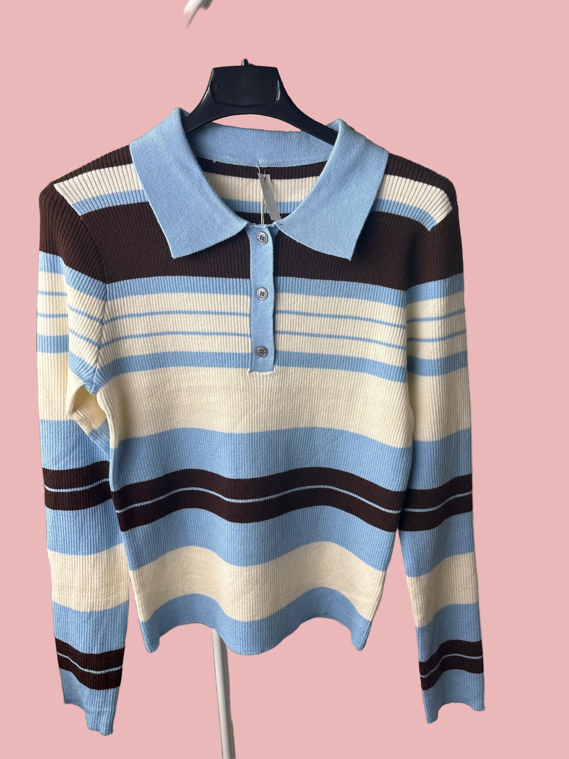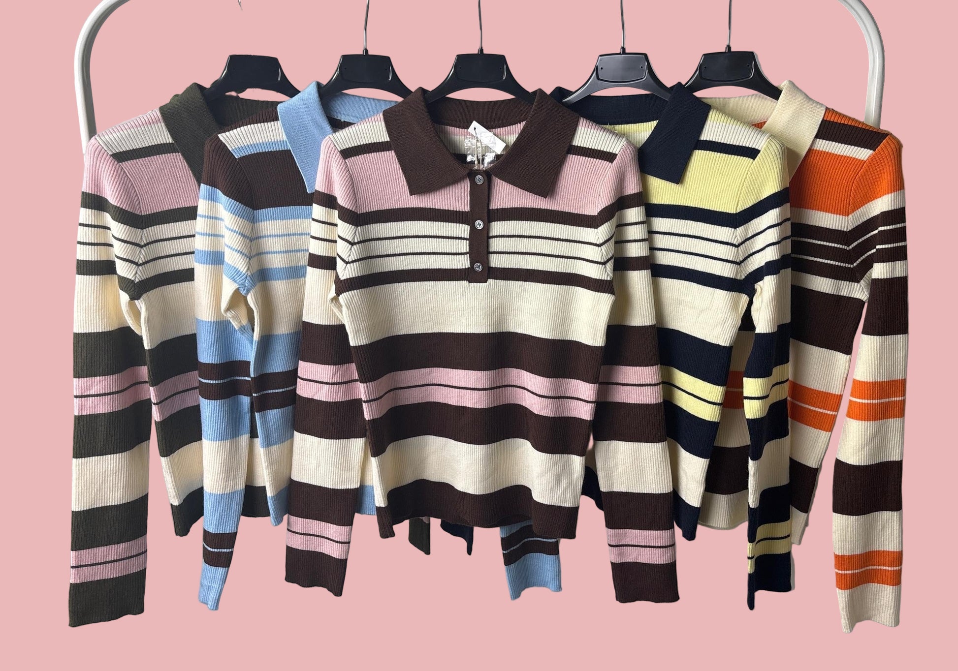 Maglia, modello Polo. Scollo a camicia e bottoni regolabili. Trama a righe, toni del grigio, bianco e rosso. Aderente. Rifiniture finali a costine. Colore base marrone