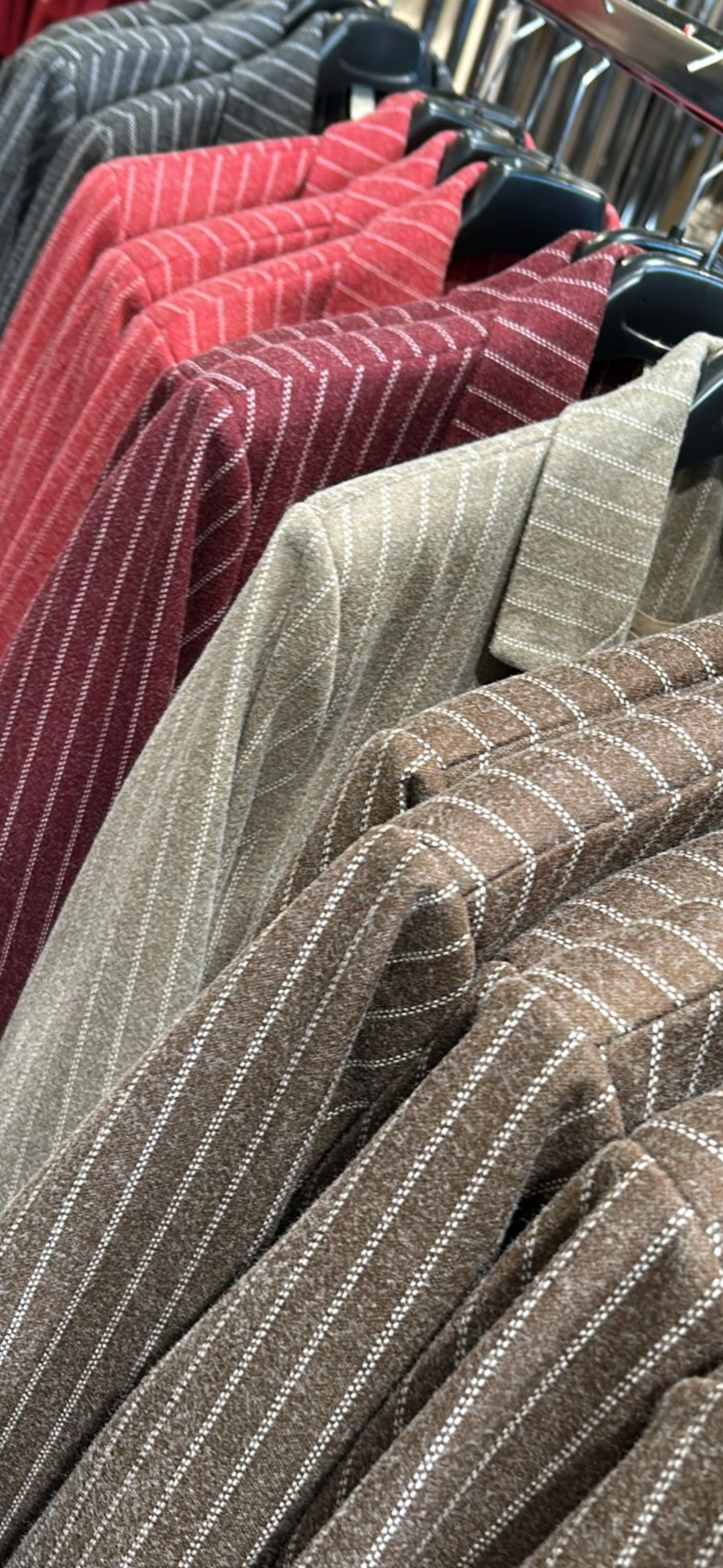 Giacca doppiopetto dal taglio strutturato, con revers classico e bottoni frontali. Le linee gessate donano un’allure sofisticata e decisa.