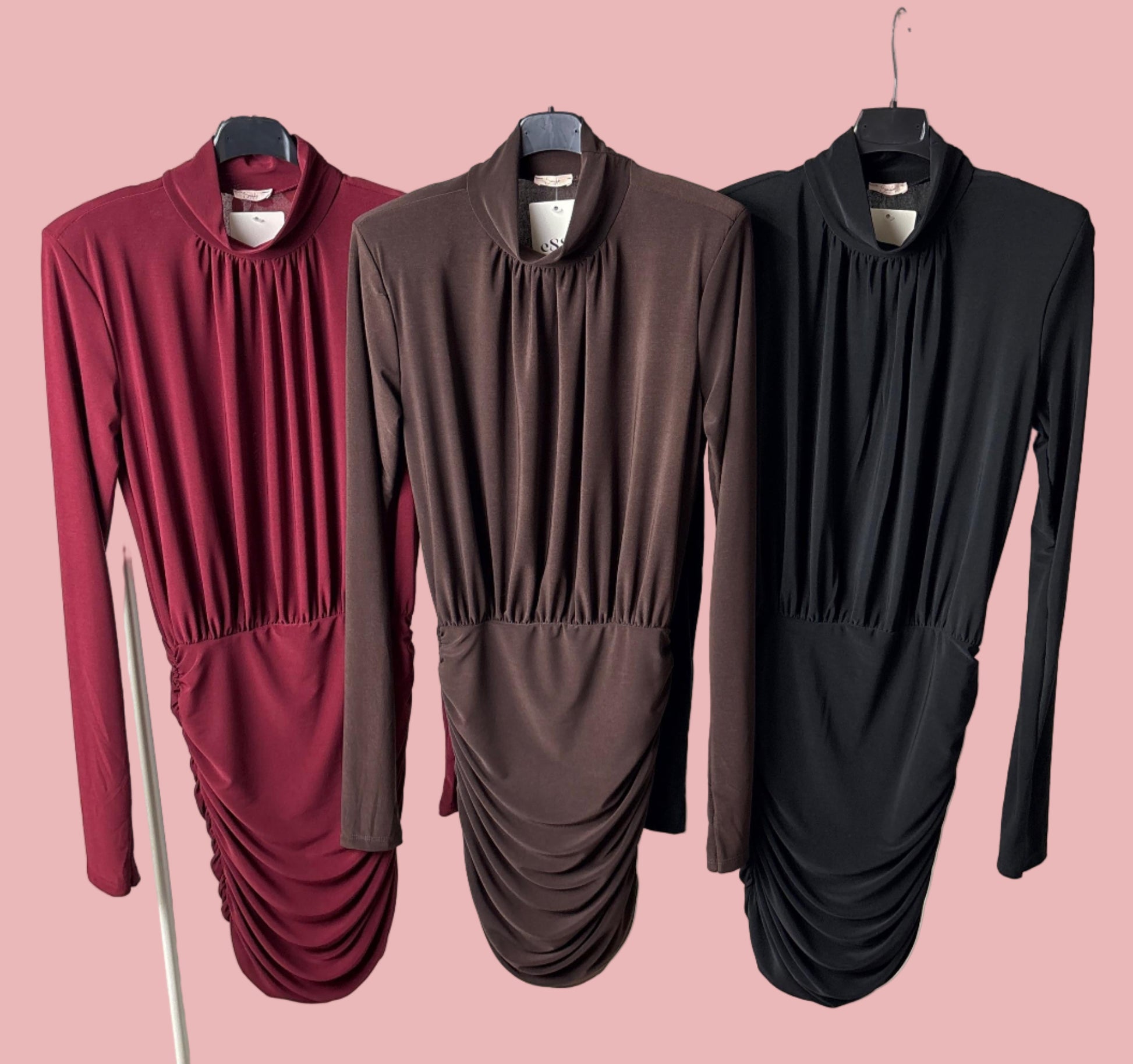 Abito corto in tessuto fluido ed elasticizzato con collo morbido alto e maniche lunghe.