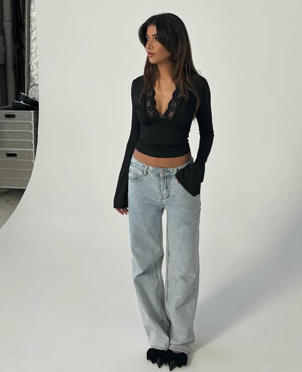 Top a maniche lunghe in tessuto elasticizzato con scollo a V rifinito in pizzo.